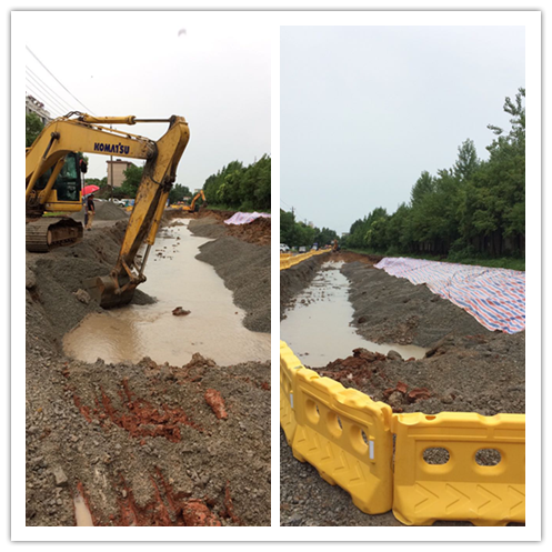 | 7月1日上午10時(shí)左右,池州市供水有限公司生產(chǎn)技術(shù)部工作人員在對(duì)供水管網(wǎng)巡查時(shí),發(fā)現(xiàn)沿江路(長江北路至池口路路段)向主城區(qū)供水DN800給水管道有近50多米裸露在外,如不及時(shí)處理,隨時(shí)都有側(cè)滑的可能,一旦發(fā)生側(cè)滑,全城將不能正常供水。 巡查人員立即將此情況向公司總經(jīng)理吳小平匯報(bào),同時(shí)展開調(diào)查,了解到具體原因是中鐵四局施工單位在進(jìn)行路基換填時(shí),對(duì)開挖的100多米基坑未及時(shí)回填,又未采取任何保護(hù)措施,加上連日暴雨,導(dǎo)致此險(xiǎn)情的發(fā)生。了解情況后,生產(chǎn)技術(shù)部立即聯(lián)系施工單位,安排機(jī)械設(shè)備進(jìn)場搶修。   接到險(xiǎn)情匯報(bào),公司總經(jīng)理吳小平第一時(shí)間來到現(xiàn)場,隨后市住建委副主任、黨組副書記余祖平、市公用事業(yè)局李應(yīng)有局長也冒雨親臨現(xiàn)場,協(xié)調(diào)指揮搶修。