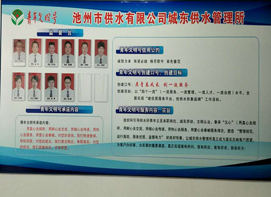 2017年9月1日,池州市供水有限公司城東供水管理所被市創(chuàng)建青年文明號活動組委會授予2016年度“青年文明號”榮譽稱號。