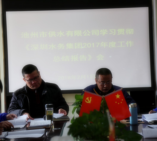 2018年1月29日深圳水務(wù)集團(tuán)公司2017年工作總結(jié)會(huì)議順利召開后,2月1日上午,池州市供水有限公司迅速組織班子成員及各部門負(fù)責(zé)人在公司三樓會(huì)議室集中學(xué)習(xí)深水集團(tuán)黨委書記、董事長(zhǎng)胡嘉東所作的《2017年工作總結(jié)報(bào)告》。
