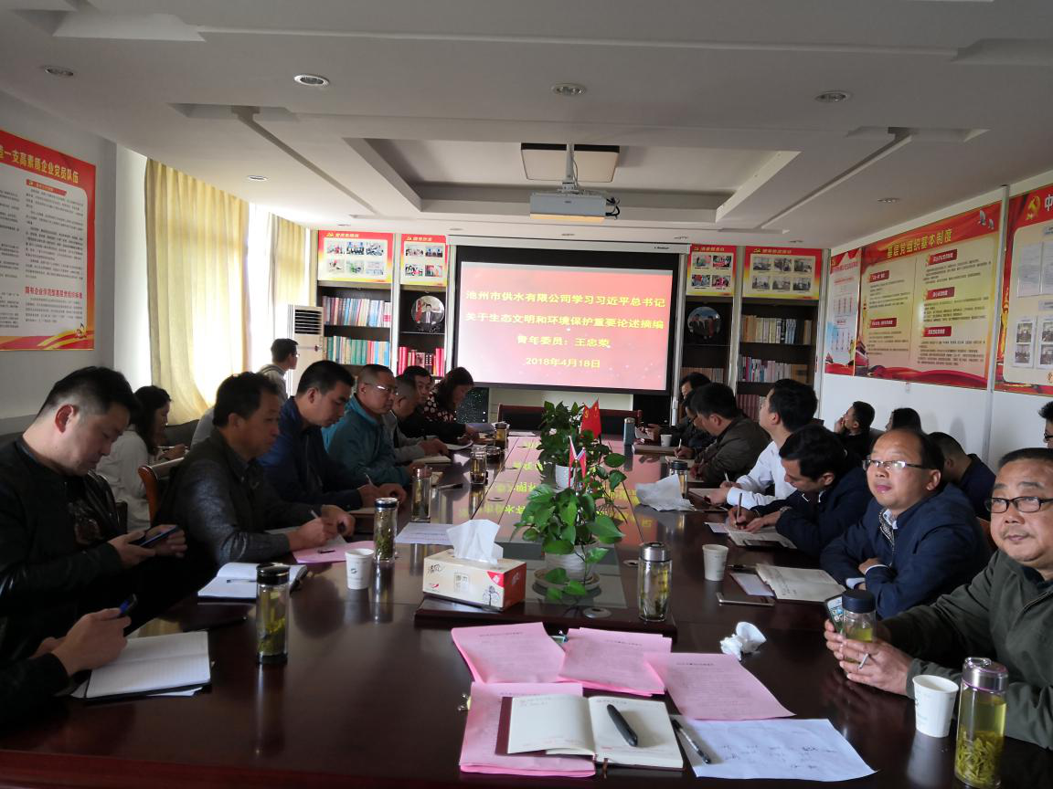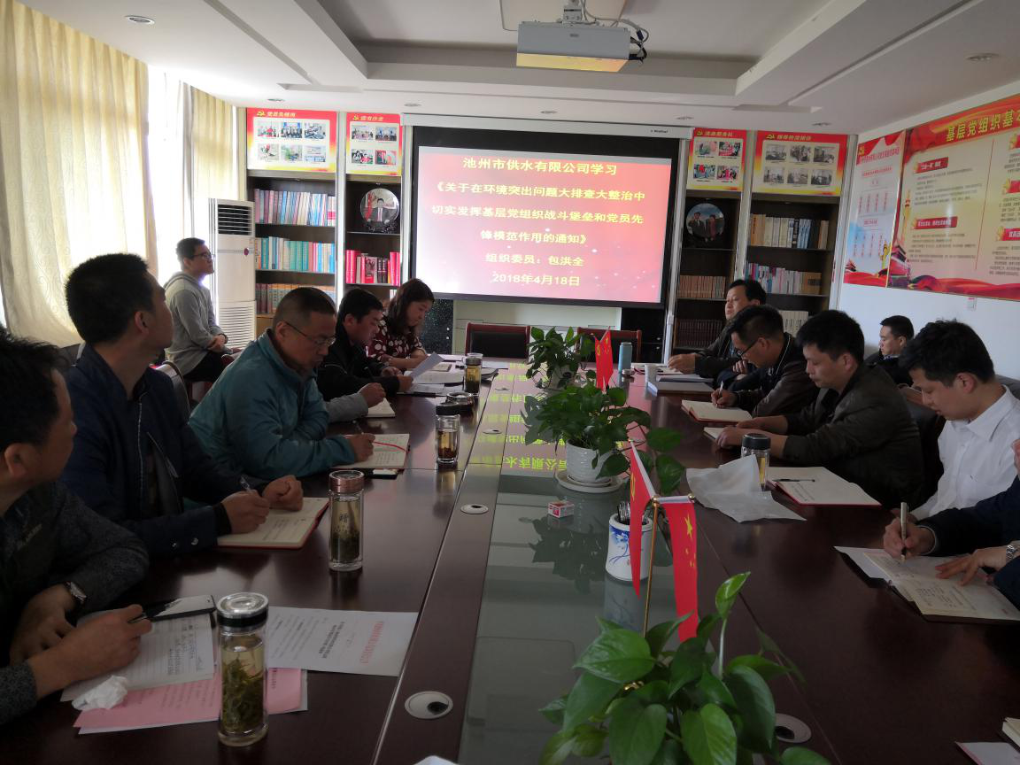 根據(jù)上級(jí)黨組織文件要求,2018年4月18日,池州市供水有限公司黨支部組織全體黨員和入黨積極分子學(xué)習(xí)了《習(xí)近平總書(shū)記關(guān)于生態(tài)文明和環(huán)境保護(hù)重要論述摘編》和市委組織部《關(guān)于在環(huán)境突出問(wèn)題大排查大整治中切實(shí)發(fā)揮基層黨組織戰(zhàn)斗堡壘和黨員先鋒模范作用的通知》。