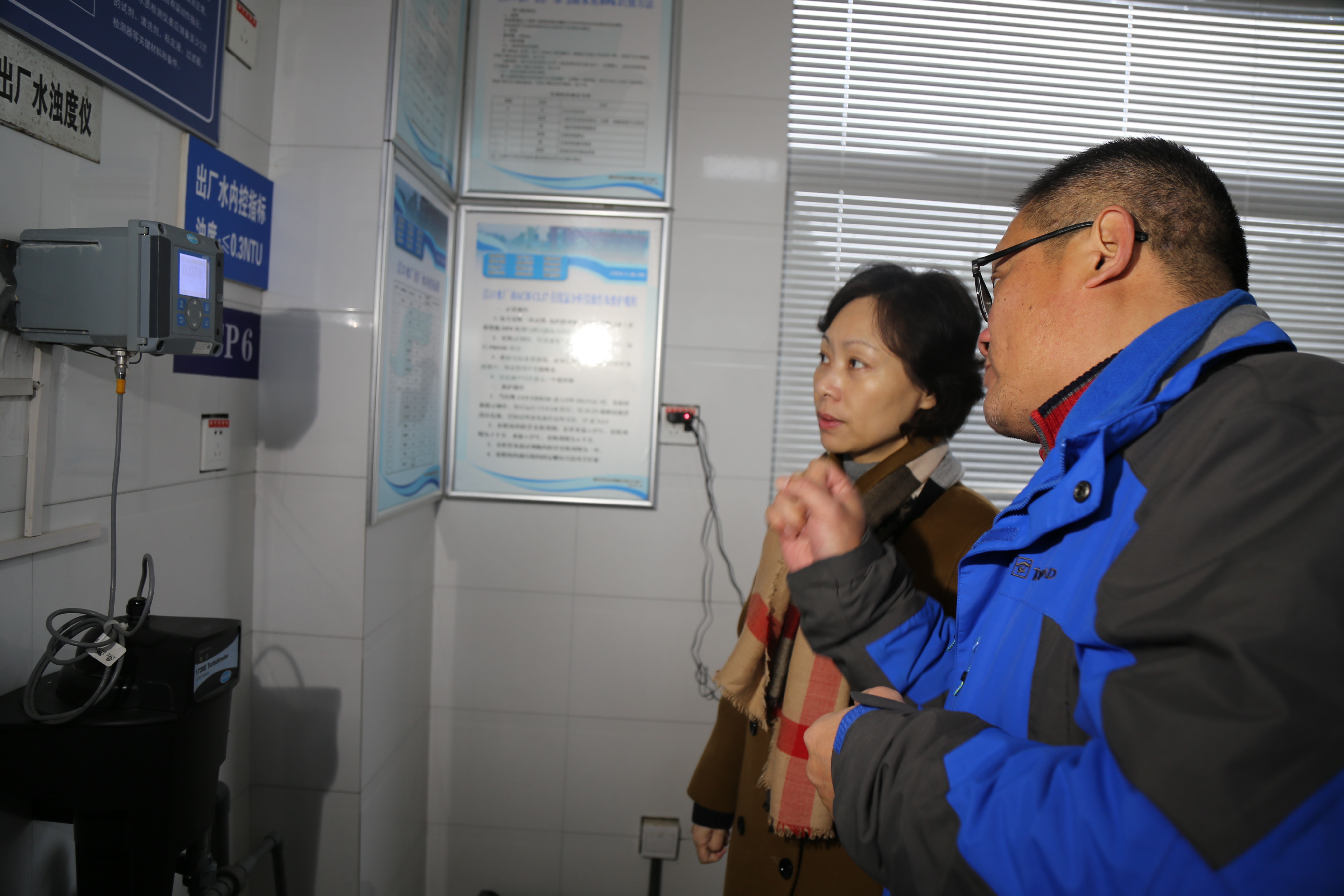 王宏書記一行仔細(xì)查看了江口水廠制水工藝流程,詳細(xì)詢問了水廠運(yùn)行、供水量、水質(zhì)監(jiān)測(cè)、春節(jié)應(yīng)急保障等情況,在江口水廠送水泵房在線儀表裝置前,當(dāng)了解到公司執(zhí)行了優(yōu)于國標(biāo)的水質(zhì)標(biāo)準(zhǔn)(深水標(biāo)準(zhǔn))以及嚴(yán)格的HACCP水質(zhì)管理體系后,王書記表示滿意。她還饒有興趣地打開了江口水廠原水抽濾瓶進(jìn)行查看。