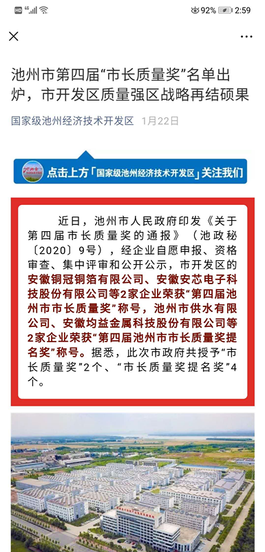 近日,從池州市人民政府傳來好消息:池州市第四屆“市長質量獎”評選塵埃落定,獲獎企業(yè)名單全市發(fā)布。池州市供水有限公司經(jīng)過組織申報、資格審查、集中評審和公開公示等一系列規(guī)范流程,以資料審核和現(xiàn)場評審總排名第三的成績摘得池州市第四屆“市長質量獎提名獎”的桂冠。