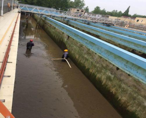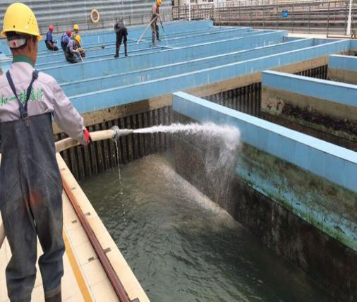 23日早晨,清洗人員全部準備就緒,在做好安全防護措施后,先是將平流池鋼槽及不銹鋼折板絮凝池池壁進行清洗,隨后排空平流池,在確定水位足夠時,清洗人員穿好雨衣雨褲,用爬梯下到池底,將連接好的龍帶進行高壓噴射清洗。公司分管領(lǐng)導(dǎo)和水廠負責人全程現(xiàn)場指導(dǎo)清洗,提醒清洗人員注意安全。經(jīng)過8個小時多的奮戰(zhàn),池底的淤泥終于在下午5:00清洗干凈,清洗人員安全有序的從池底撤出來,收拾好沖洗工具,擺放整齊,順利完成了本次平流池的清洗工作。