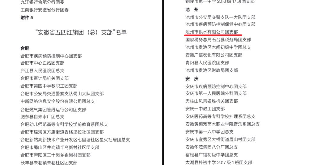 在五四青年節(jié)來臨之際 ,共青團安徽省委下發(fā)表彰,對2019年度安徽省優(yōu)秀共青團員、團干部和先進基層團組織進行表彰。其中池州市供水有限公司團支部榮獲“安徽省五四紅旗團支部”榮譽稱號。