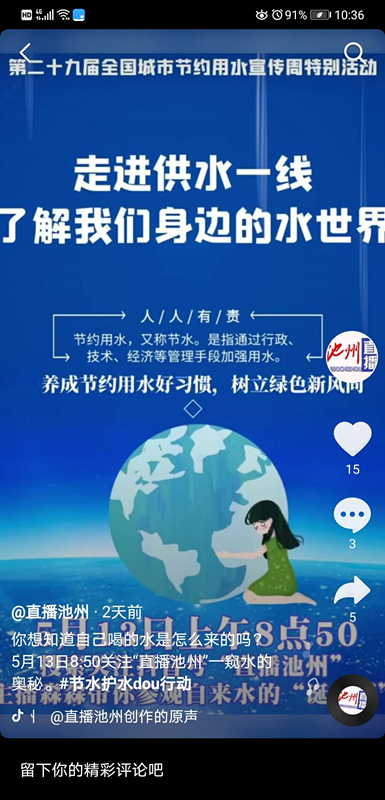 “使用抖音直播等宣傳工具是我們基于疫情防控需要的慎重考慮,同時(shí)也是抓住時(shí)代脈搏、跟上新興媒體做好宣傳工作的有益嘗試,我們最終愿望是希望更多人的能珍惜水資源、養(yǎng)成節(jié)約用水好習(xí)慣”,池州供水公司相關(guān)領(lǐng)導(dǎo)接受采訪時(shí)表示,“同時(shí),我們希望一直以來關(guān)心、愛護(hù)我們的社會(huì)各界領(lǐng)導(dǎo)、用戶和好朋友們能更深入、細(xì)致、直觀的了解我們,一如既往地支持我們,同時(shí),我們也用這樣的方式告訴更多的人,奮斗,我們一直在路上。”