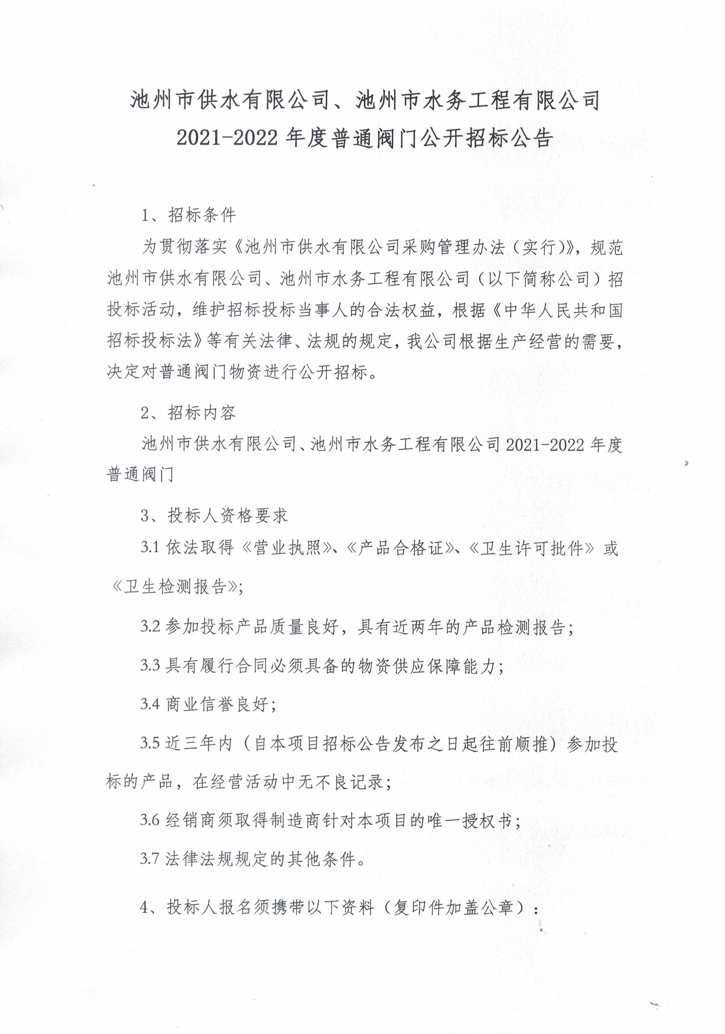 | 池州市供水有限公司、池州市水務(wù)工程有限公司2021-2022年度普通閥門公開招標公告 | |