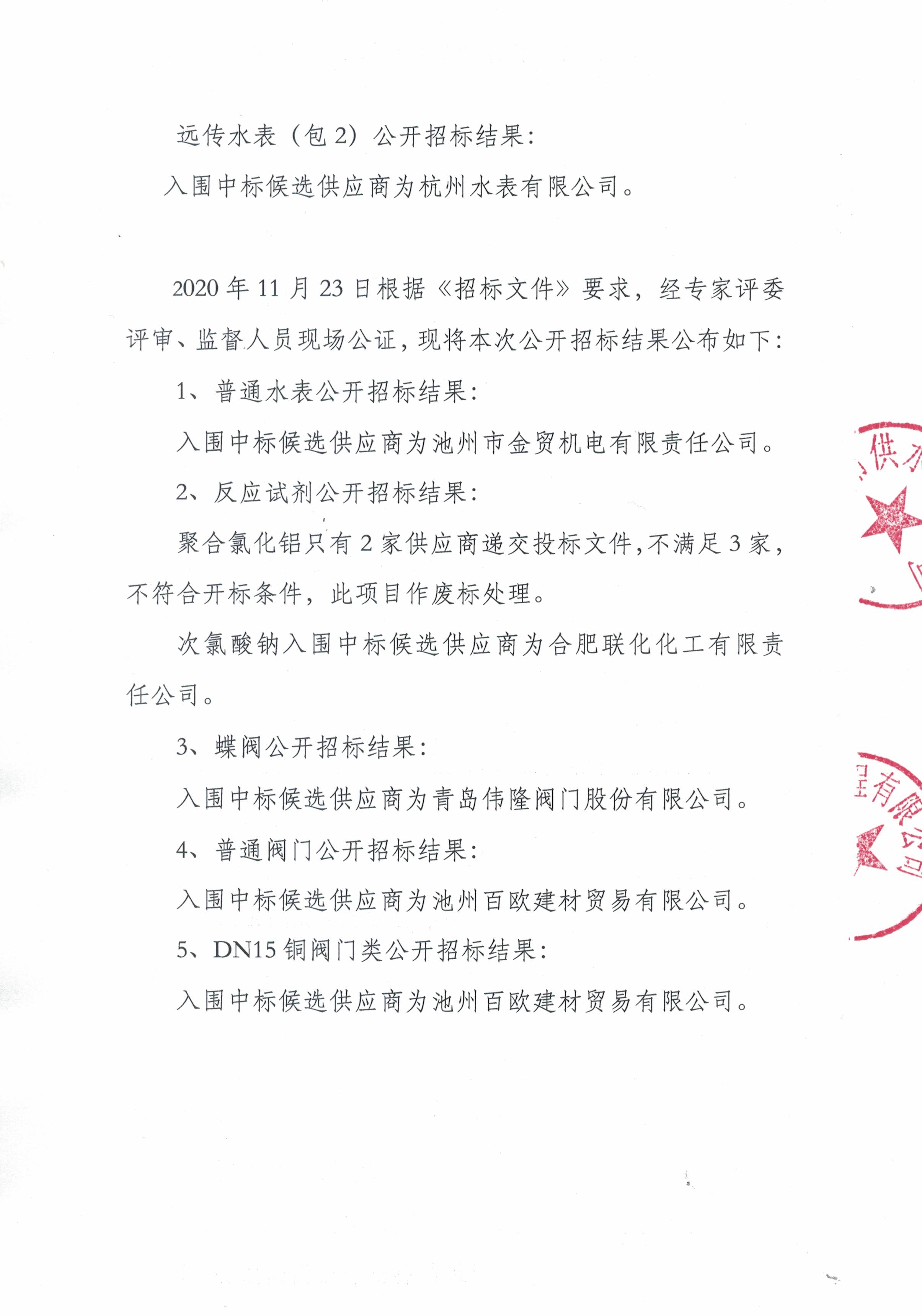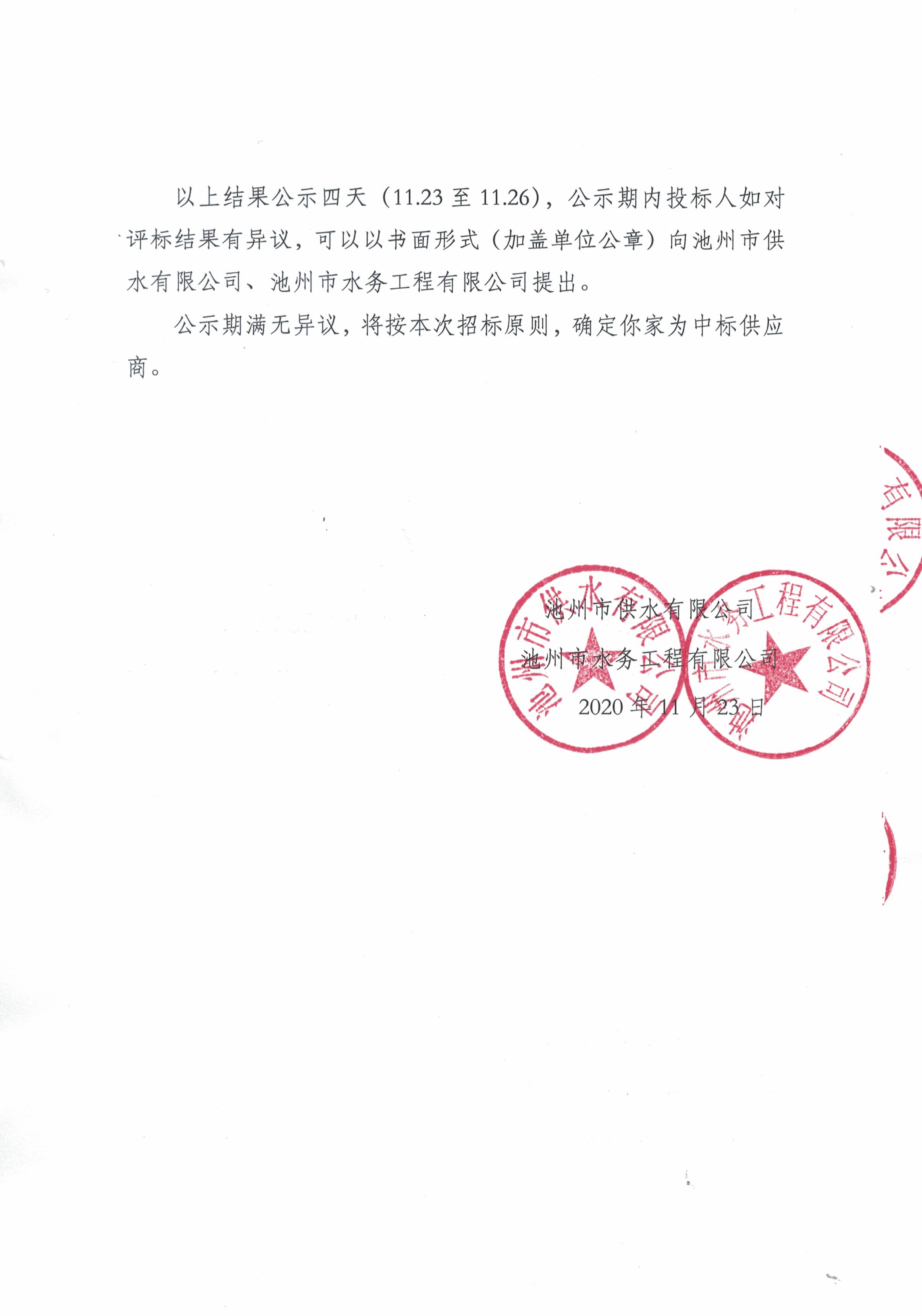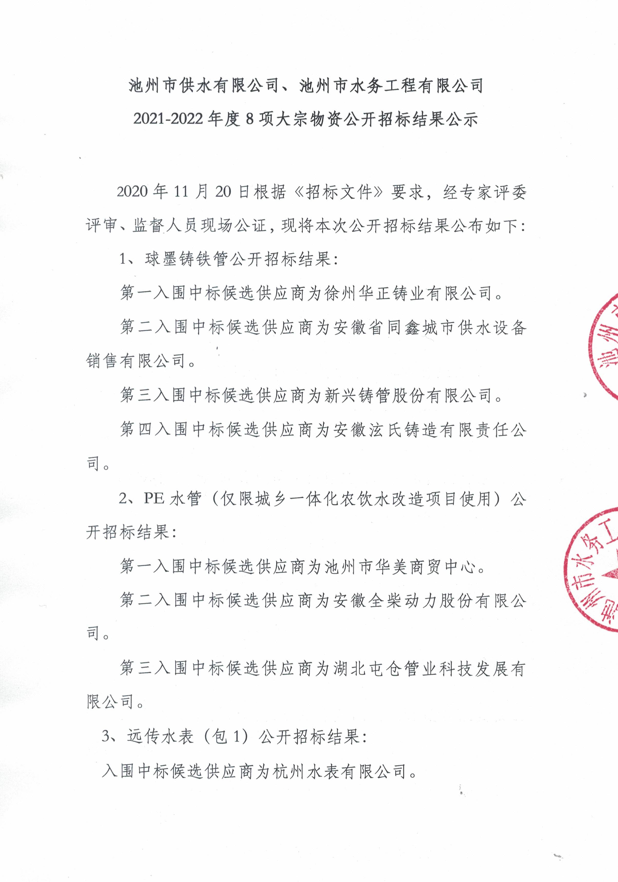 | 池州市供水有限公司、池州市水務(wù)工程有限公司2021-2022年度8項大宗物資公開招標結(jié)果公示 | |