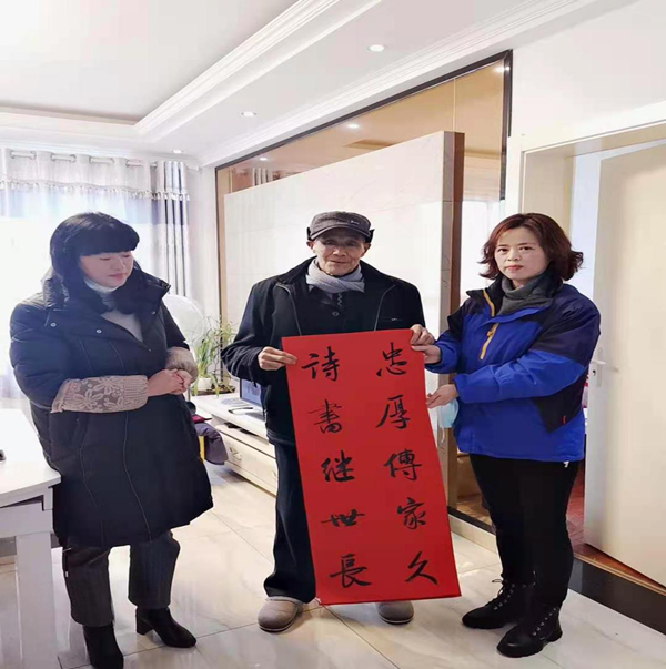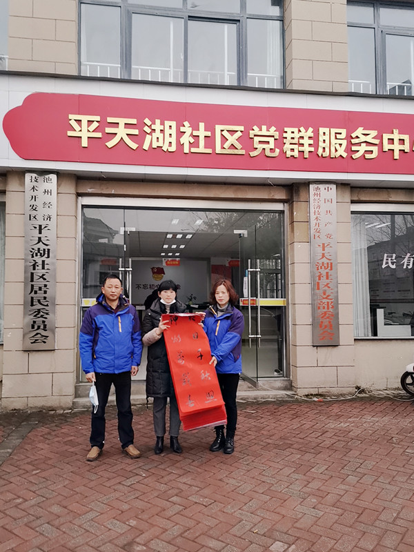平天湖社區(qū)是供水公司多年文明創(chuàng)建共建單位,送春聯(lián)的第一站,施潔主席一行就選擇了和諧共建、關(guān)系融洽的平天湖社區(qū)。胡桂珍書記她們?cè)缭绲卦陂T口迎接,熱情洋溢地表達(dá)對(duì)公司的感謝和共建愉悅之情。“供水公司太有心了,每年都請(qǐng)人手寫對(duì)聯(lián),送到我們社區(qū),社區(qū)居民有福了,大家都很喜歡這手寫對(duì)聯(lián),感謝供水公司愛心。”,胡書記如是說(shuō)。
