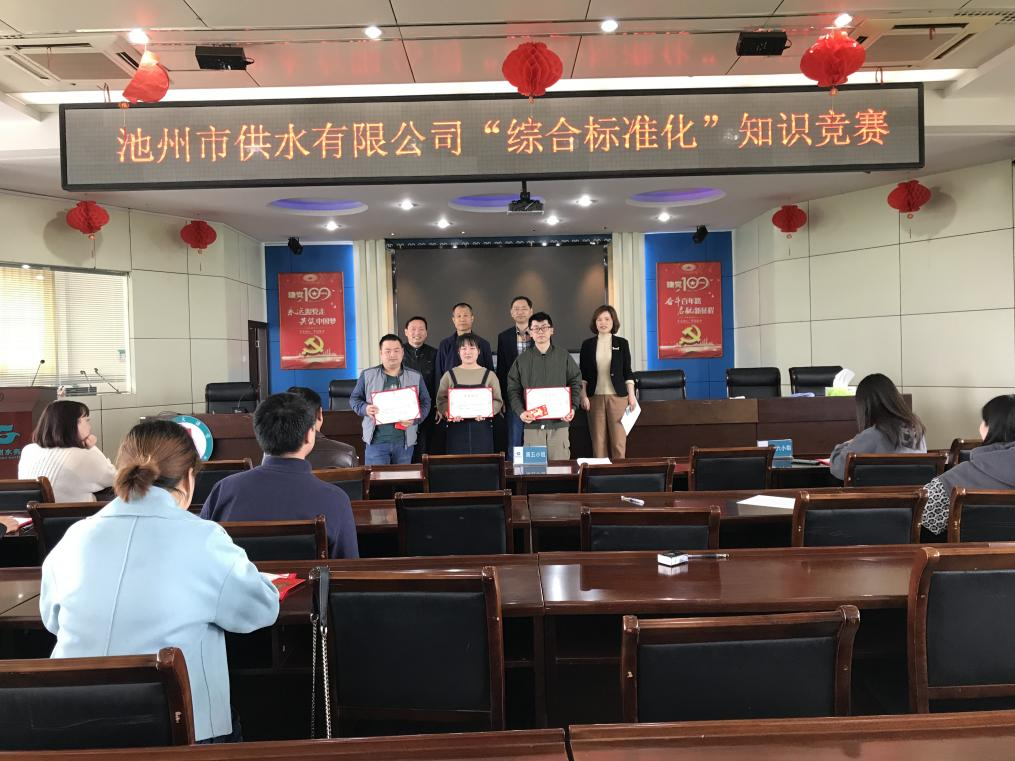 | ——池州市供水有限公司舉辦“綜合標(biāo)準(zhǔn)化”知識(shí)競(jìng)賽   為推動(dòng)公司省級(jí)社會(huì)管理和公共服務(wù)綜合標(biāo)準(zhǔn)化試點(diǎn)單位創(chuàng)建工作,助力供水服務(wù)向?qū)I(yè)化、規(guī);、標(biāo)準(zhǔn)化、品牌化方向發(fā)展,進(jìn)一步提高公司人員整體素質(zhì)和業(yè)務(wù)知識(shí)水平,2021年4月27日,池州市供水有限公司舉辦了“綜合標(biāo)準(zhǔn)化”知識(shí)競(jìng)賽,共有來(lái)自公司各個(gè)部門(mén)的八支代表隊(duì)參加。市場(chǎng)監(jiān)管局標(biāo)準(zhǔn)化科科長(zhǎng)李志成受邀出席本次活動(dòng)。