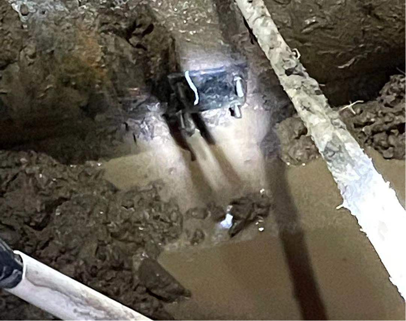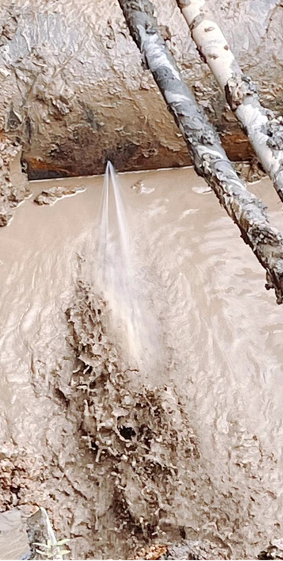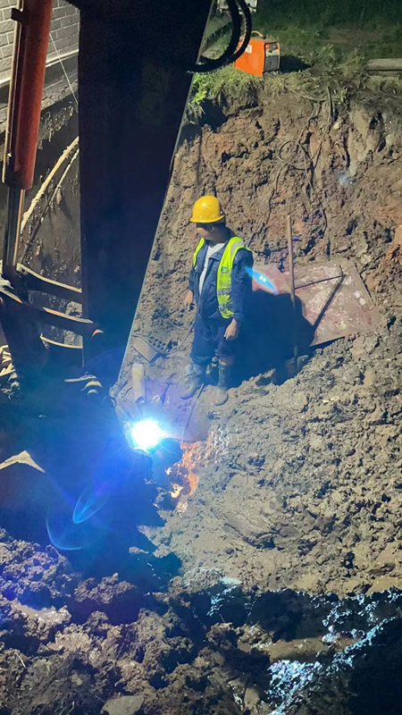 下午16:00,施工人員組織開挖尋找漏點(diǎn),發(fā)現(xiàn)漏點(diǎn)后,準(zhǔn)備進(jìn)行停水維修,但因漏點(diǎn)在出廠主干管道上,若停水施工將造成城區(qū)大范圍水壓下降,局部地區(qū)甚至中斷供水。正在施工人員困擾之際,現(xiàn)場技術(shù)人員經(jīng)過仔細(xì)商討,提出了一個(gè)非常巧妙地解決辦法。由于管道破損點(diǎn)很小,破損點(diǎn)周圍管道狀況良好,未出現(xiàn)擴(kuò)散性裂痕,技術(shù)人員提議采用“打補(bǔ)丁”的辦法對(duì)管道進(jìn)行維修,用一塊鋼板下面墊上橡膠片堵住漏點(diǎn),四周用螺栓錨固,再將鋼板四周與管道焊接牢固,用這樣一塊“補(bǔ)丁”封堵迅速漏點(diǎn)。