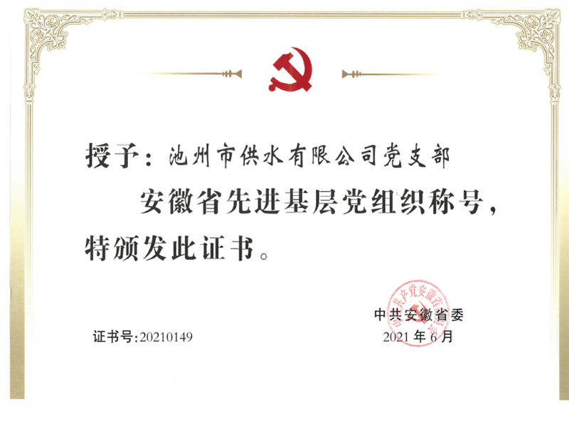 6月30日,在喜迎中國共產(chǎn)黨百年華誕之際,池州供水黨支部榮獲“安徽省先進基層黨組織”光榮稱號。這是池州市唯一獲此殊榮的國企代表,是池州供水黨支部的無尚光榮,是一個將被池州供水歷史銘記的高光時刻,是對池州供水全體黨員砥礪奮斗、敢打硬仗的高度褒獎,更是對全體池州供水人點滴奮斗、甘于奉獻的充分肯定!