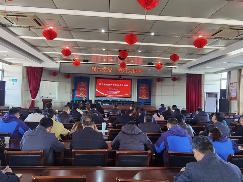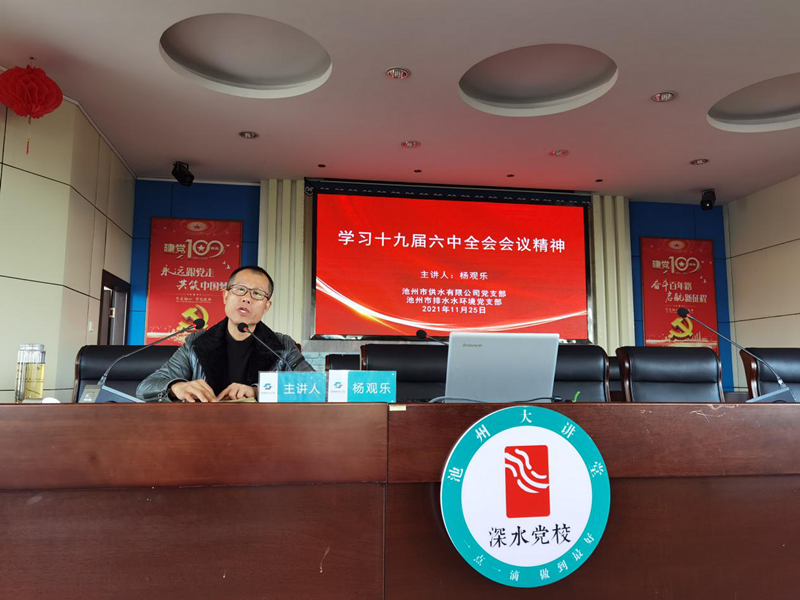 11月25日,池州市供水、排水、水環(huán)境公司黨支部聯(lián)合開展深水黨!こ刂荽笾v堂第7期,支部書記楊觀樂傳達學(xué)習(xí)黨的十九屆六中全會精神,宣傳委員施潔上《一樣的初心,不一樣的精彩》專題黨課。