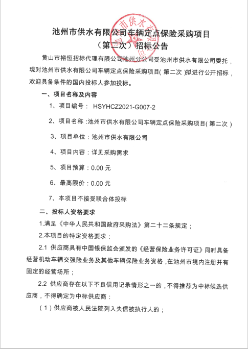 | 池州市供水有限公司車(chē)輛定點(diǎn)保險(xiǎn)采購(gòu)項(xiàng)目(第二次)招標(biāo)公告次) | |