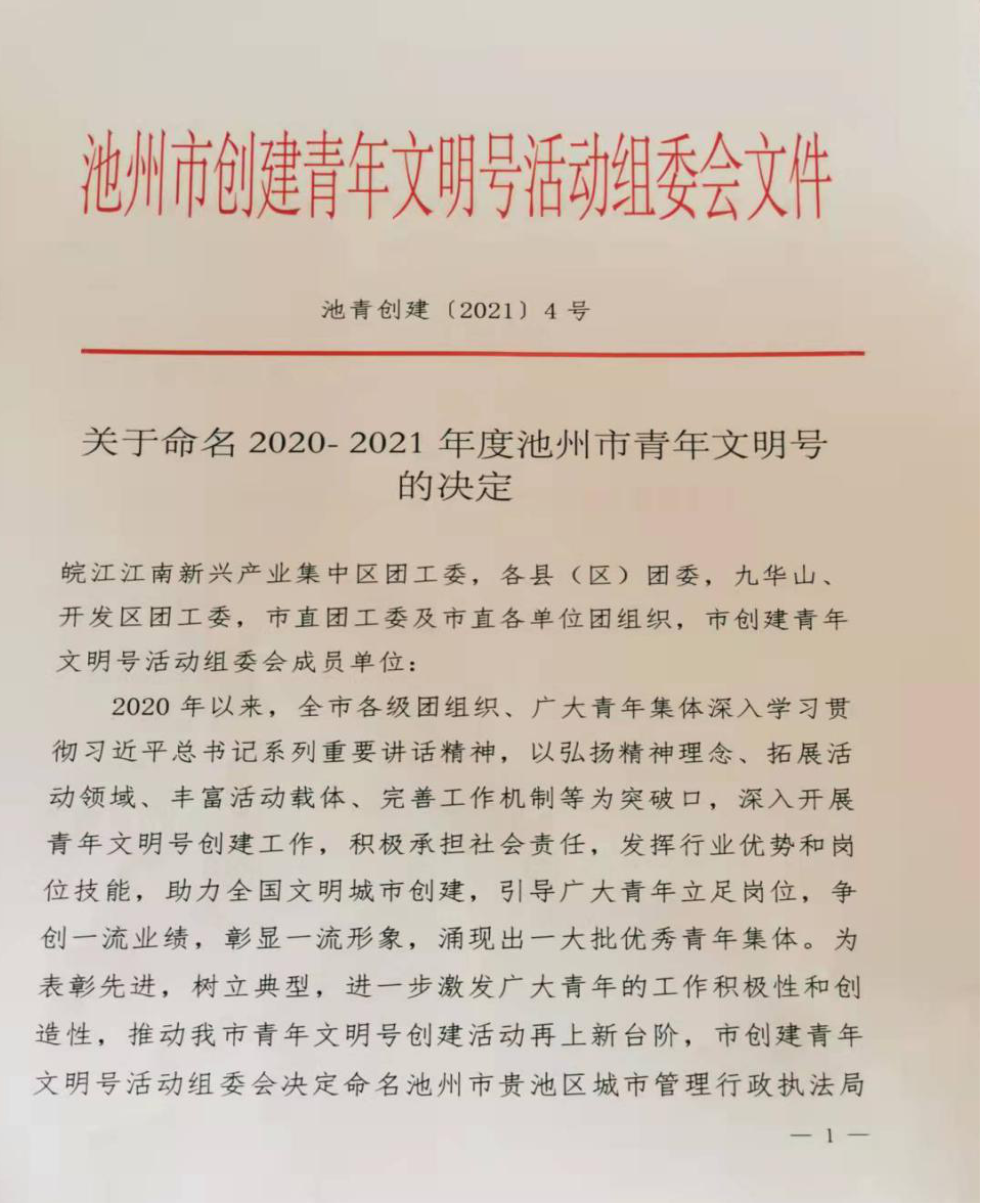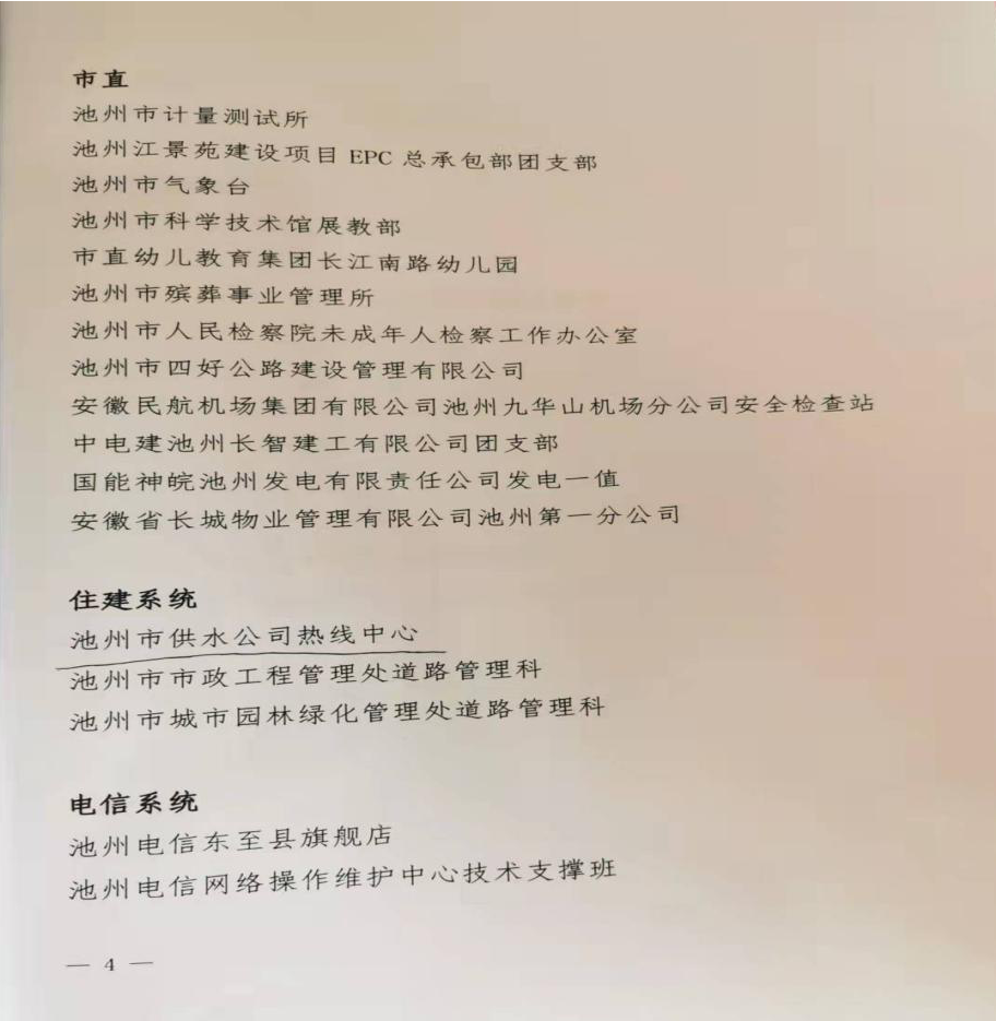 |               近日,共青團(tuán)委聯(lián)合多個(gè)單位共同發(fā)布《關(guān)于命名2020-2021年度池州市青年文明號(hào)的決定》,經(jīng)過(guò)長(zhǎng)期的努力和奮斗,池州供水公司熱線中心從眾多創(chuàng)建集體中脫穎而出,獲評(píng)2021年度市級(jí)“青年文明號(hào)”稱號(hào)!這也是熱線中心繼2015年之后,再次榮獲該榮譽(yù)稱號(hào)。