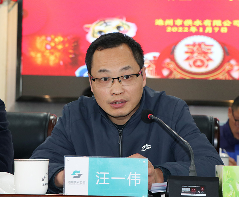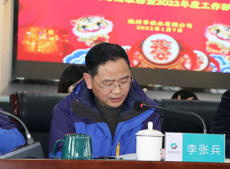 會議伊始,李張兵作題為《改革奮進(jìn)  開脫創(chuàng)新  精彩繪就池州供水發(fā)展新的美麗畫卷》的工作報告。他指出,在“兩個一百年”奮斗目標(biāo)歷史交匯點的2021年,我們堅持以習(xí)近平新時代中國特色社會主義思想為指導(dǎo),立足新發(fā)展階段,貫徹新發(fā)展理念,積極融入新發(fā)展格局,聚焦經(jīng)營指標(biāo)、規(guī)范管理、高效運營、創(chuàng)新創(chuàng)造、融合發(fā)展,實現(xiàn)高質(zhì)量發(fā)展與民生保障同步前進(jìn)、依法治企與自覺自律同向發(fā)力、供水保障與服務(wù)提升同步跨越、改革與傳承同生共鳴、黨建與經(jīng)營同頻共振。他強(qiáng)調(diào),2021年,公司售水量突破3400萬噸大關(guān)、簽署《池州市貴池區(qū)城鄉(xiāng)供水一體化合作框架協(xié)議》、投資約350萬余元完成涓橋鎮(zhèn)聯(lián)合村等800戶村民自來水安裝,助力鄉(xiāng)村振興戰(zhàn)略;集中完成57個老舊小區(qū)供水設(shè)施改造、系統(tǒng)性開展控差控漏,產(chǎn)銷差再創(chuàng)10.29%的佳績;同時實施人力資源結(jié)構(gòu)優(yōu)化,開展中層管理人員競聘上崗和員工雙向選擇競爭上崗,為公司高質(zhì)量發(fā)展奠定了堅實的人才基礎(chǔ);公司黨支部成功入選“領(lǐng)航計劃”省級示范庫,喜獲安徽省“先進(jìn)基層黨組織”光榮稱號,公司獲第九屆“池州市文明單位”、“池州市雙擁優(yōu)秀單位”榮譽稱號等。他要求,2022年,我們要緊扣水價調(diào)整和深化改革兩條主線,聚力黨建引領(lǐng)、運營保障、創(chuàng)新發(fā)展和經(jīng)營管理,上下同心、扎實工作,努力實現(xiàn)公司高質(zhì)量轉(zhuǎn)型發(fā)展。