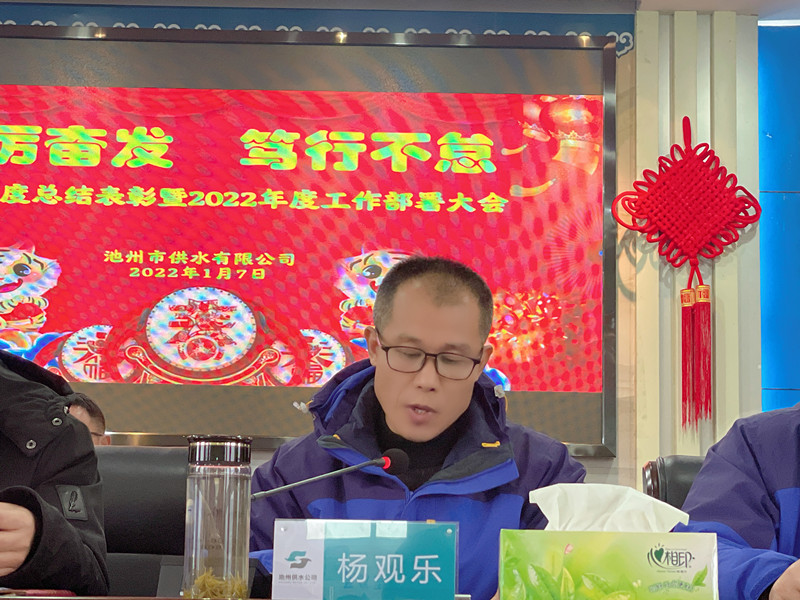 楊觀樂作題為《緊盯目標(biāo)  厚積成勢  高質(zhì)量發(fā)展閃耀出靚麗新成色》的主旨講話。他連用四個“歷史性”成績評價了公司2021年取得的各項工作成績。他強(qiáng)調(diào),2022年,我們要堅持以習(xí)近平新時代中國特色社會主義思想為指導(dǎo),觀大局、把大勢、調(diào)結(jié)構(gòu)、重內(nèi)生,緊緊圍繞兩條主線,聚力黨建引領(lǐng)、運營保障、創(chuàng)新發(fā)展和經(jīng)營管理,戮力同心、扎實工作,努力實現(xiàn)公司更可持續(xù)更高質(zhì)量的發(fā)展。他指出,我們要從嚴(yán)治黨,筑牢公司黨建的“壓艙石”、從長計議,培育公司長久發(fā)展的“動力源”、強(qiáng)化責(zé)任落實、加快隱患整改、實施技術(shù)改造,保障供水安全、提升檢測能力,加強(qiáng)水質(zhì)管控、服務(wù)民生、初心不忘,展現(xiàn)擔(dān)當(dāng)作為新氣象、圍繞中心、同向發(fā)力,匯聚公司發(fā)展新動能;他號召大家,披荊斬棘、披肝瀝膽,闖出了一個充滿自信的池州供水;我們還要同心同力、風(fēng)雨兼程,創(chuàng)造一個更加輝煌的池州供水。