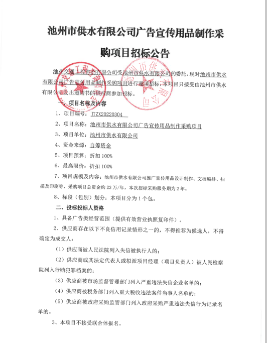 | 池州市供水有限公司廣告用品制作采購項(xiàng)目招標(biāo)公告 | |