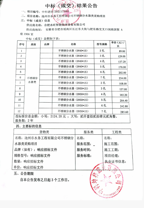 ----------------------------------------------------------------------------------- 上一篇:中標(biāo)公告 下一篇:2022年池州市供水有限公司... |