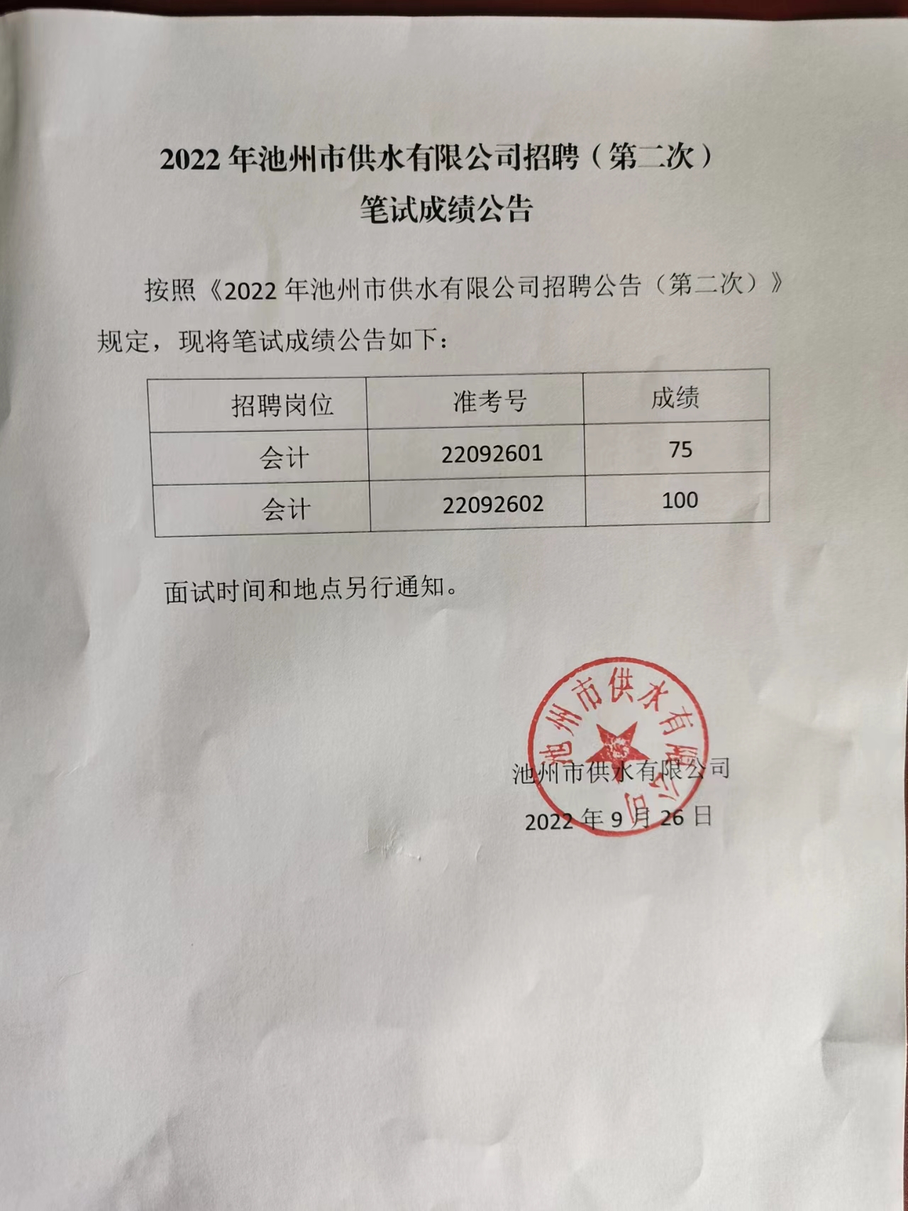 | 2022年池州市供水有限公司招聘(第二次)筆試成績公示 | |