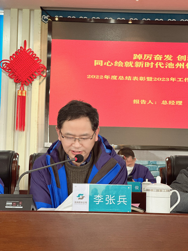 會(huì)議第一項(xiàng),李張兵總經(jīng)理作題為《踔厲奮發(fā) 創(chuàng)新實(shí)干 同心繪就新時(shí)代池州供水發(fā)展新華章》的年度工作報(bào)告。他指出,2022年,是黨的二十大勝利召開及“十四五”規(guī)劃承上啟下的一年,這一年,我們堅(jiān)持以習(xí)近平新時(shí)代中國特色社會(huì)主義思想為指導(dǎo),堅(jiān)持高質(zhì)量發(fā)展統(tǒng)領(lǐng)全局,聚焦主業(yè)主責(zé),突出做好供水保障、創(chuàng)新服務(wù)、智慧賦能、產(chǎn)業(yè)鏈延伸等各項(xiàng)工作,較好地完成了各項(xiàng)目標(biāo)任務(wù);2022年,我們實(shí)現(xiàn)供、售水量、營業(yè)收入、稅收多重突破、穩(wěn)定增長,用戶數(shù)達(dá)24萬余戶,產(chǎn)銷差再創(chuàng)10.19%的佳績;我們成功接收梅龍片區(qū),深度參與貴池區(qū)城鄉(xiāng)供水一體化工程,積極配合清溪大道改造等市政重點(diǎn)工程;堅(jiān)持大安全觀,統(tǒng)籌安全生產(chǎn)、疫情防控和經(jīng)營發(fā)展;全面梳理各級(jí)管理制度,編制完成公司智慧水務(wù)頂層架構(gòu)設(shè)計(jì)、池州市城市“十四五”供水發(fā)展規(guī)劃;深入開展二十大精神學(xué)習(xí),持續(xù)開展深水黨校·池州大講堂,建設(shè)人才儲(chǔ)備蓄水池、做好文明創(chuàng)建賡續(xù)的接力棒等。2022年,公司客服中心榮獲安徽省住建廳“文明服務(wù)窗口”、汪學(xué)斌同志喜獲安徽省勞動(dòng)模范。公司順利完成第十三屆安徽省文明單位考核,連續(xù)5年榮獲池州市雙擁優(yōu)秀單位稱號(hào)。他強(qiáng)調(diào)2023年是池州供水創(chuàng)新發(fā)展之年,是供水保障提升的關(guān)鍵之年,新的一年,我們將堅(jiān)持以習(xí)近平新時(shí)代中國特色社會(huì)主義思想為指導(dǎo),全面貫徹黨的二十大精神,緊盯經(jīng)營目標(biāo),突出“四項(xiàng)能力”(融合發(fā)展、安全發(fā)展、創(chuàng)新發(fā)展、可持續(xù)發(fā)展),凝心聚力、踔厲奮發(fā),為推進(jìn)池州供水持續(xù)健康穩(wěn)定發(fā)展而勇毅前行。