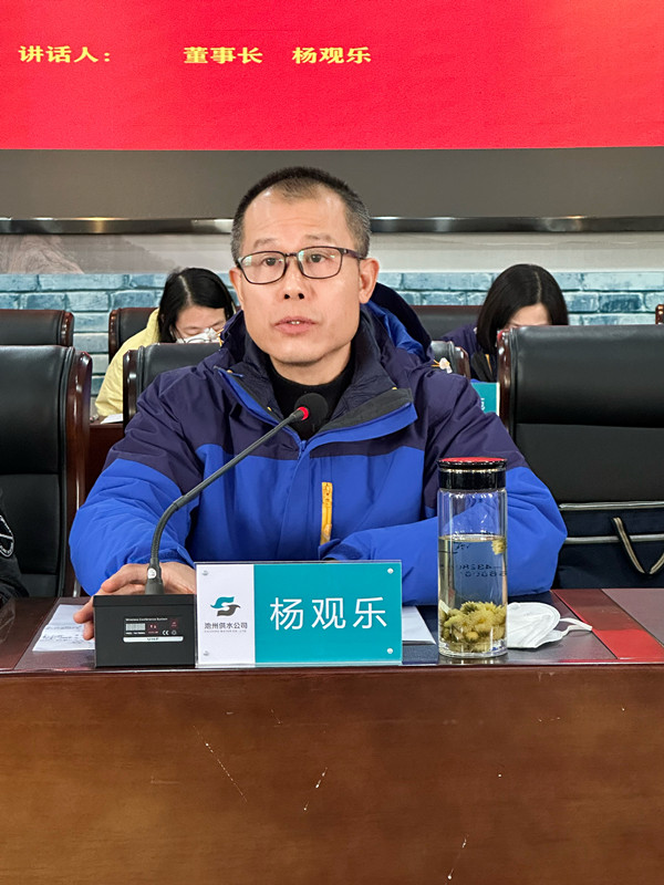會(huì)議第三項(xiàng),楊觀樂董事長作題為《砥礪深耕 奮楫篤行 奮力開創(chuàng)池州供水高質(zhì)量發(fā)展新篇章》的主旨講話。他指出,2022年,我們面對(duì)疫情防控、內(nèi)部經(jīng)營指標(biāo)和水壓水質(zhì)輿情等多重壓力,化危為機(jī)、迎難而上,緊緊依靠廣大干部職工,真抓實(shí)干、勤勉工作,在精細(xì)管理、業(yè)務(wù)拓展、民生保障、設(shè)施建設(shè)上再獲新功;這一年,我們堅(jiān)持高舉旗幟、堅(jiān)定推進(jìn)融合發(fā)展,黨建引領(lǐng)走深走實(shí);堅(jiān)持系統(tǒng)思維、堅(jiān)定深化內(nèi)部治理,企業(yè)發(fā)展活力激發(fā)迸發(fā);堅(jiān)持守正創(chuàng)新、堅(jiān)定推進(jìn)開源節(jié)流,企業(yè)經(jīng)營提質(zhì)增效;堅(jiān)持民生至上、堅(jiān)定推進(jìn)供水保障,廣大用戶有得有感。他強(qiáng)調(diào),2023年,我們一要堅(jiān)定不移聚焦黨建創(chuàng)新,打造黨建與經(jīng)營融合的新典范;二要堅(jiān)定不移聚焦提質(zhì)增效,打造供水發(fā)展的新樣板;三要堅(jiān)定不移聚焦主業(yè)主責(zé),打造民生保障的新范例;四要堅(jiān)定不移聚焦團(tuán)隊(duì)建設(shè),打造人才建設(shè)的新高地;五要堅(jiān)定不移聚焦文化引領(lǐng),打造深水品牌的新名片。他號(hào)召大家,高舉旗幟、凝心聚力、“致廣大而盡精微”、腳踏實(shí)地、迎難而上、開拓進(jìn)取,跑出“奔池速度”,在新征程上書寫新的美麗供水篇章,為新階段“三優(yōu)池州”提供強(qiáng)有力的供水支撐,為開創(chuàng)中國式現(xiàn)代化貢獻(xiàn)池水力量。