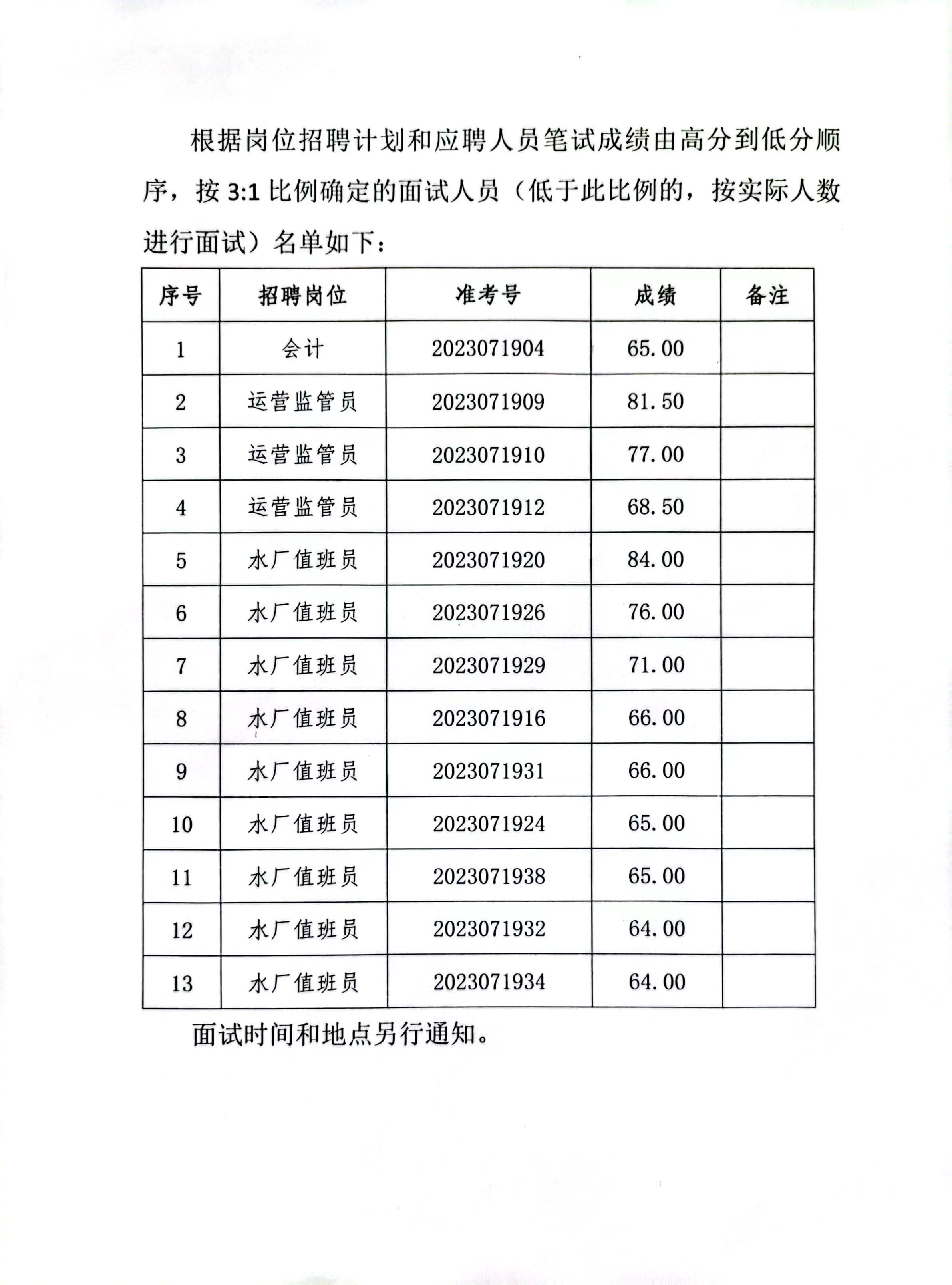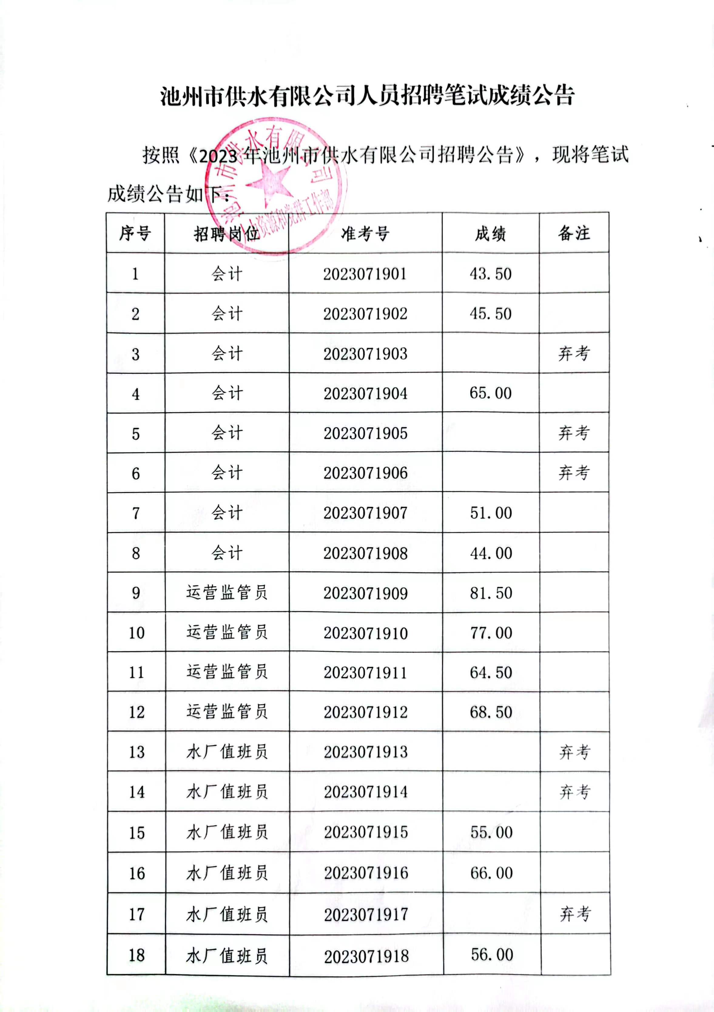 | 池州市供水有限公司人員招聘筆試成績公告 | |