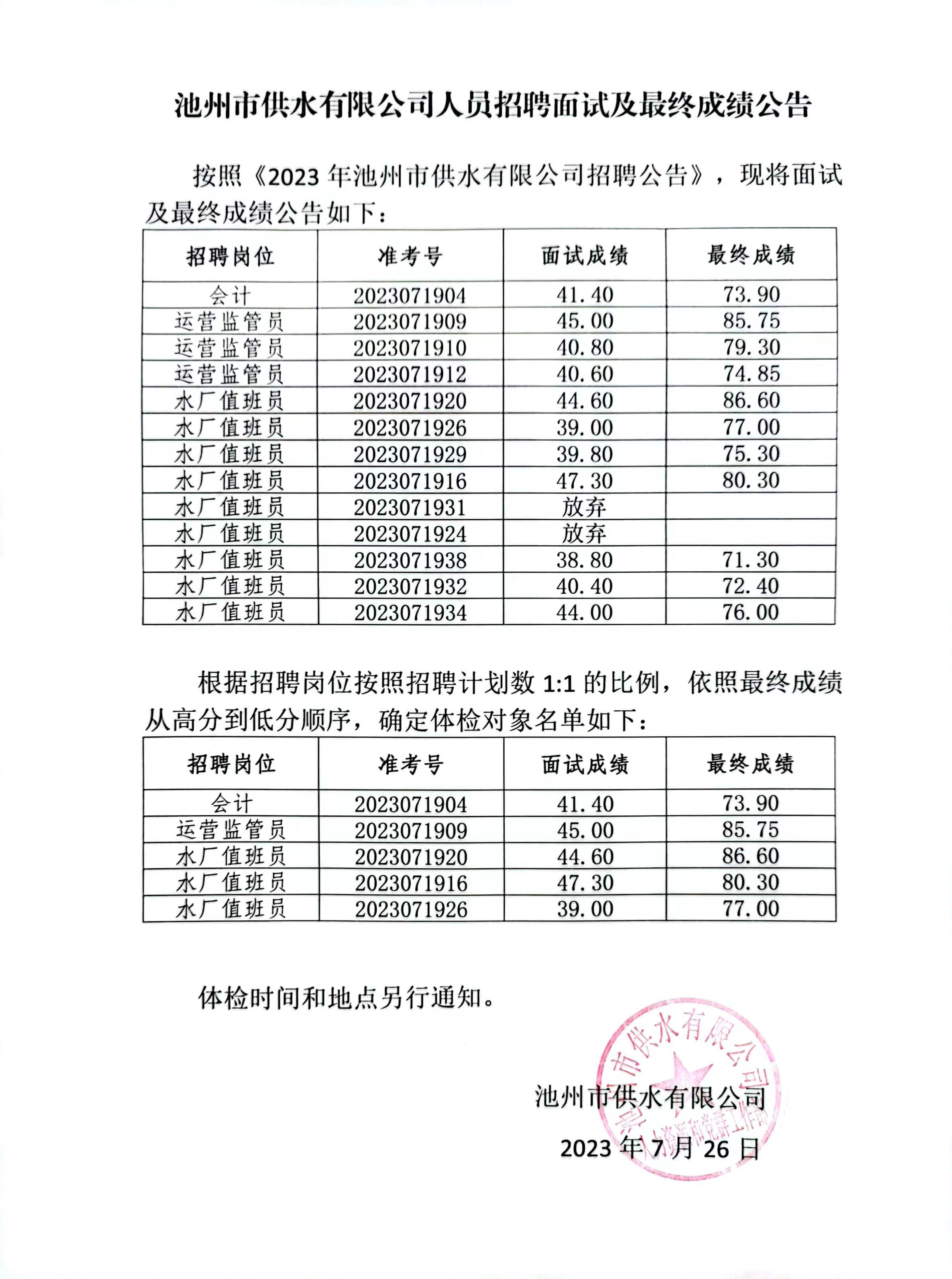 | 池州供水公司人員招聘面試及最終成績公告 | |