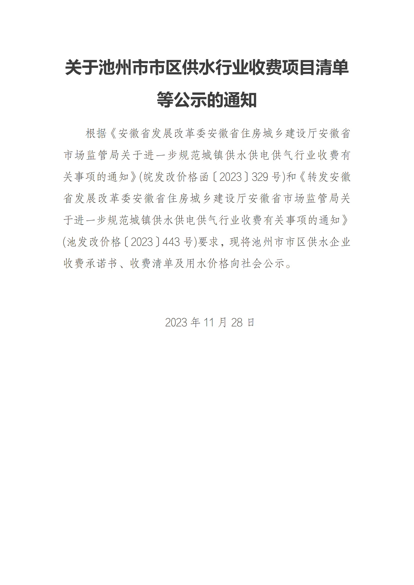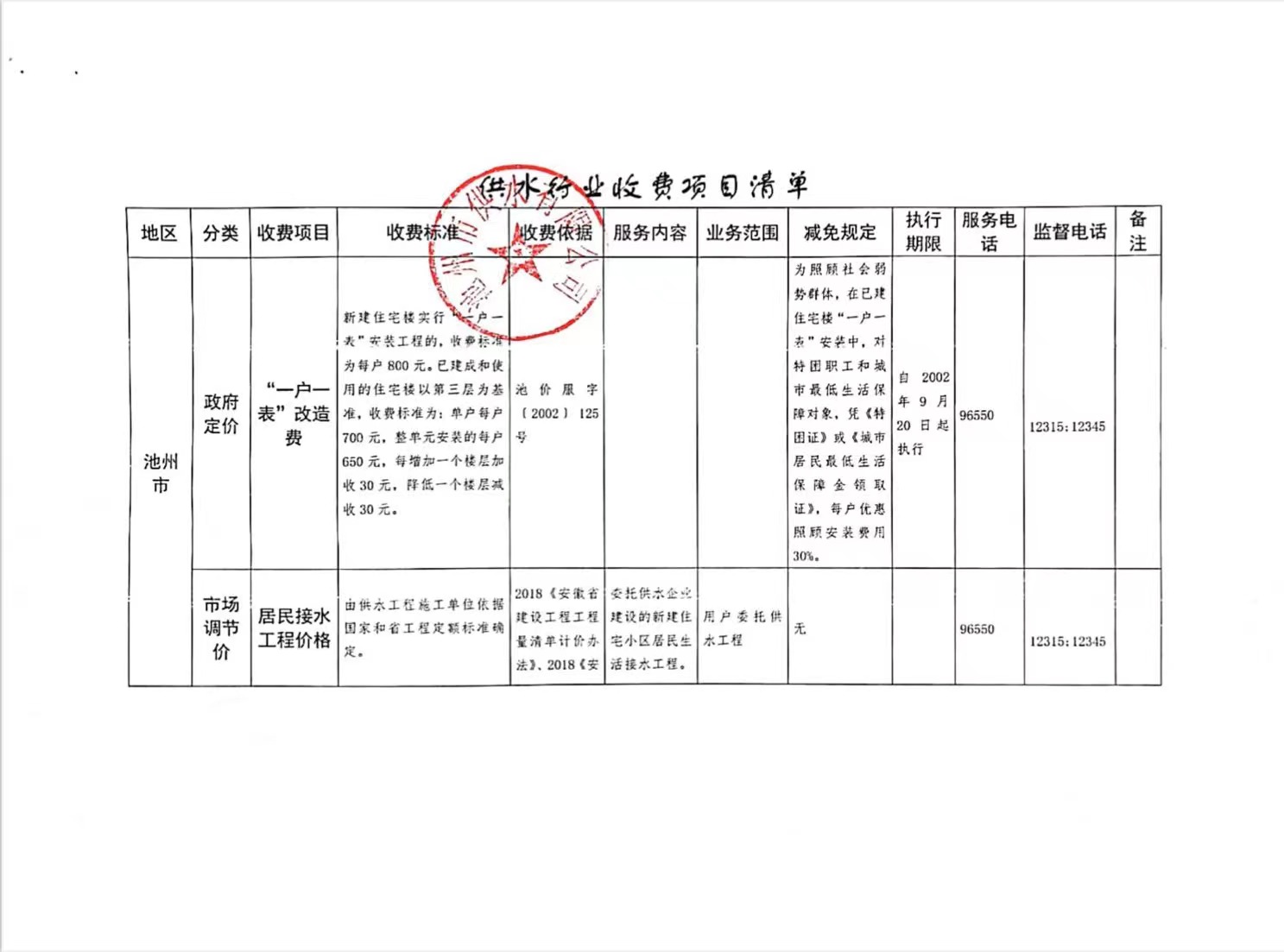 | 關(guān)于池州市市區(qū)供水行業(yè)收費(fèi)項(xiàng)目清單等公示的通知 | |