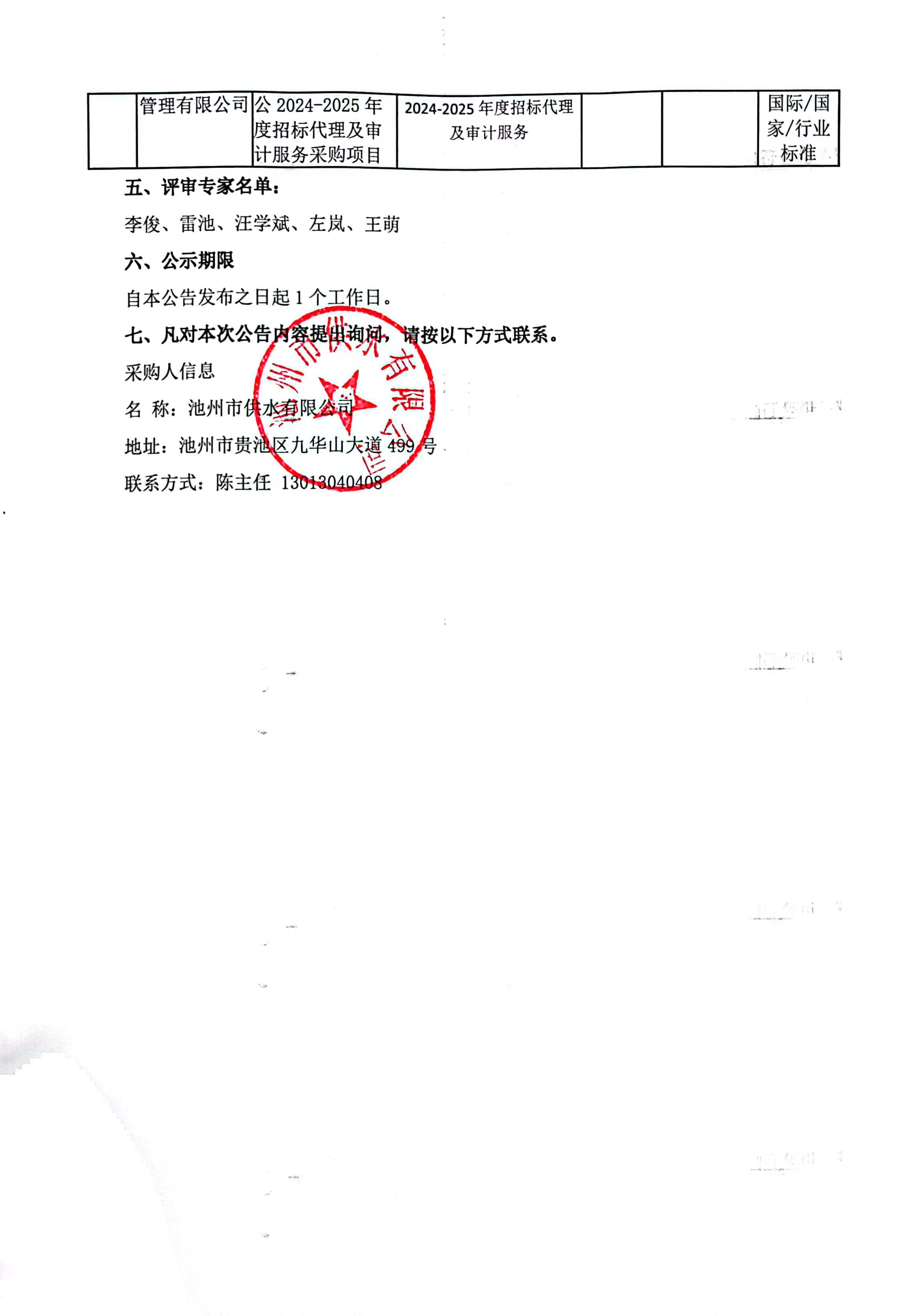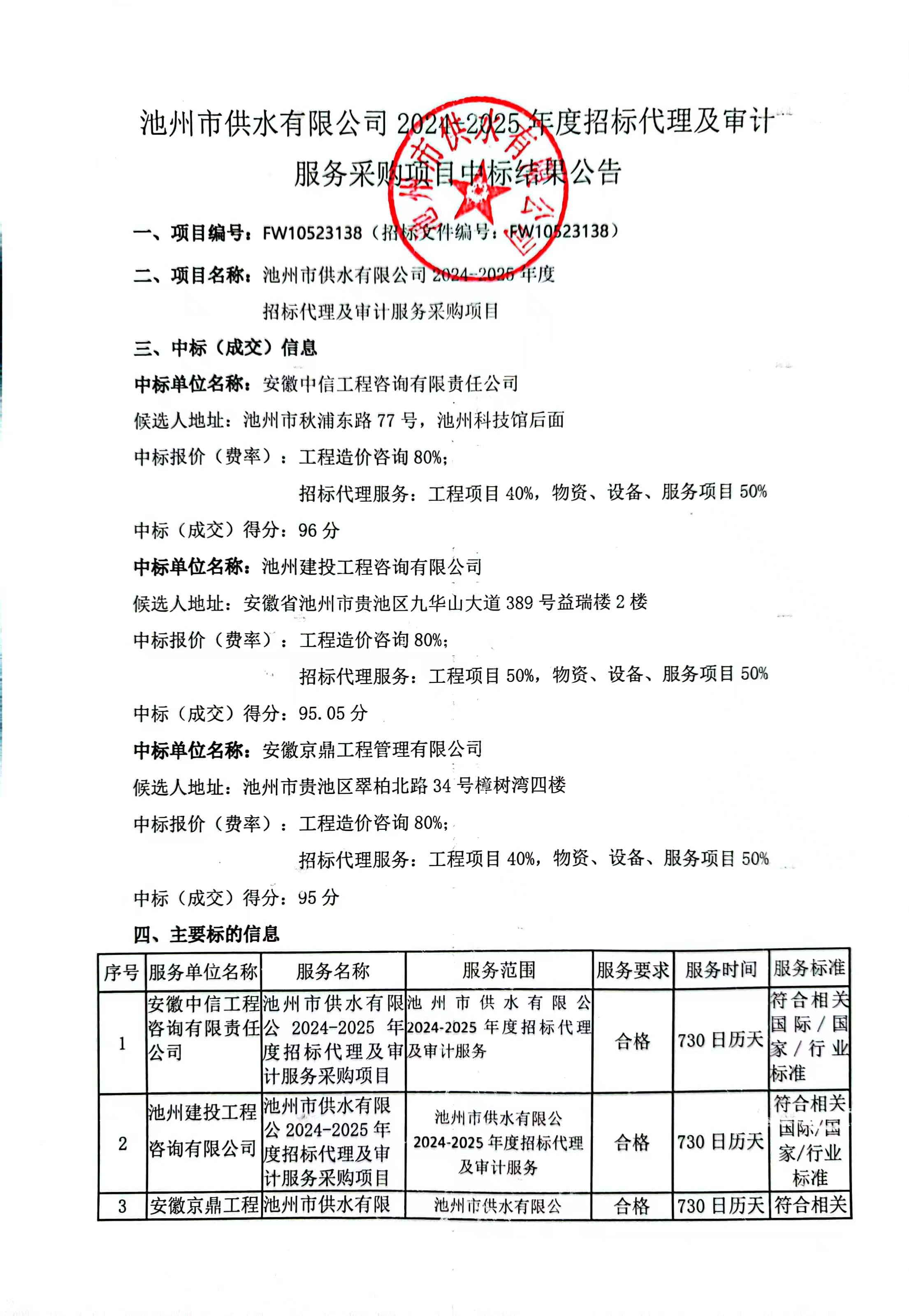 | 池州市供水有限公司2024-2025年度招標(biāo)代理及審計服務(wù)采購項目中標(biāo)公告 | |