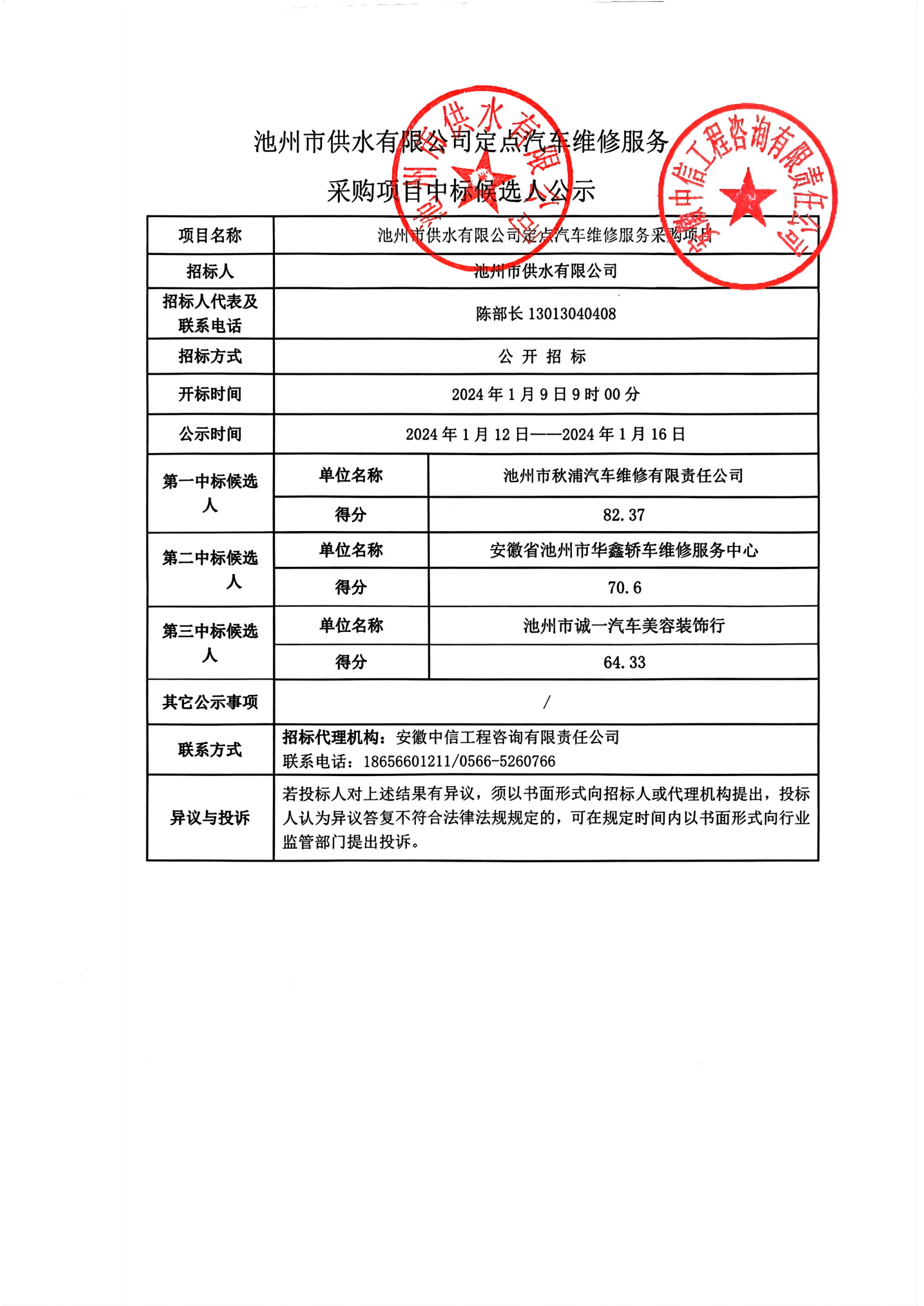 | 池州市供水有限公司定點(diǎn)汽車維修服務(wù)采購項目中標(biāo)候選人公示 | |