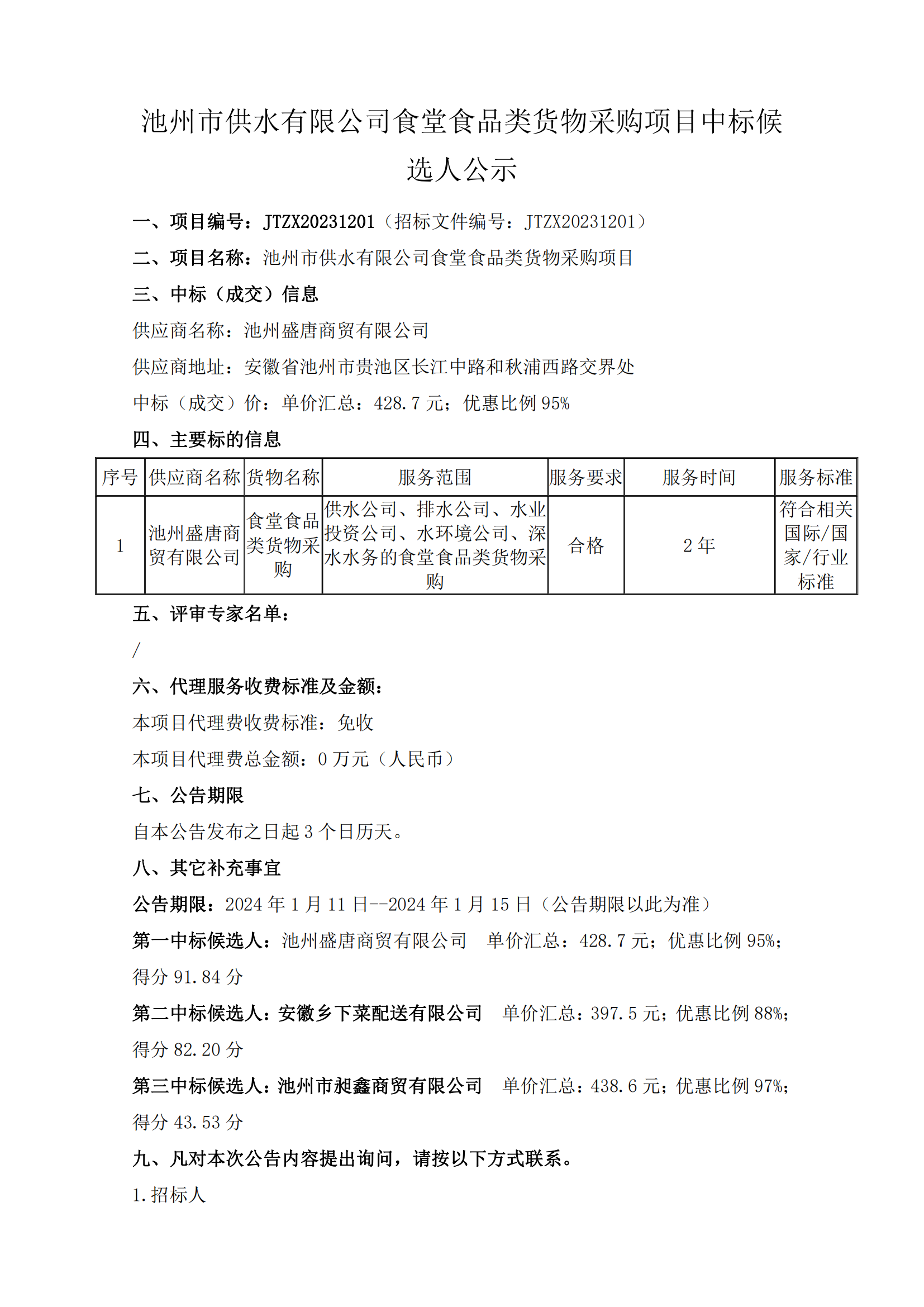 | 池州市供水有限公司食堂食品類貨物采購項(xiàng)目中標(biāo)候選人公示 | |