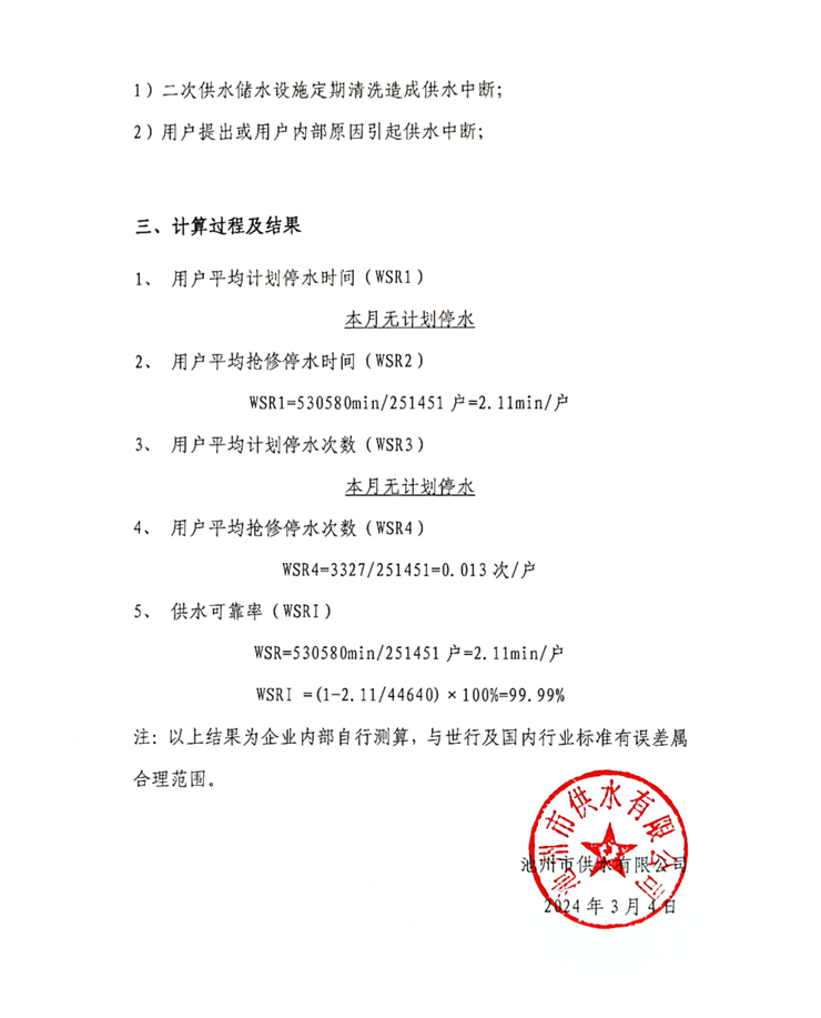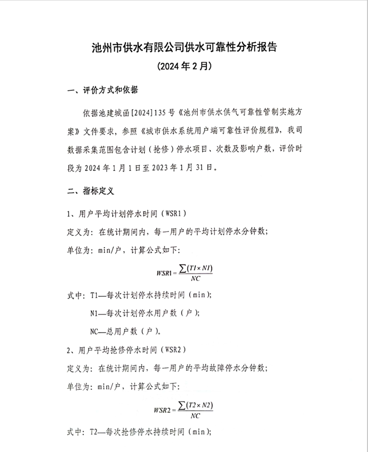 | 池州市供水有限公司供水可靠性分析報告 | |