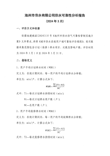| 池州市供水有限公司供水可靠性分析報(bào)告 | |