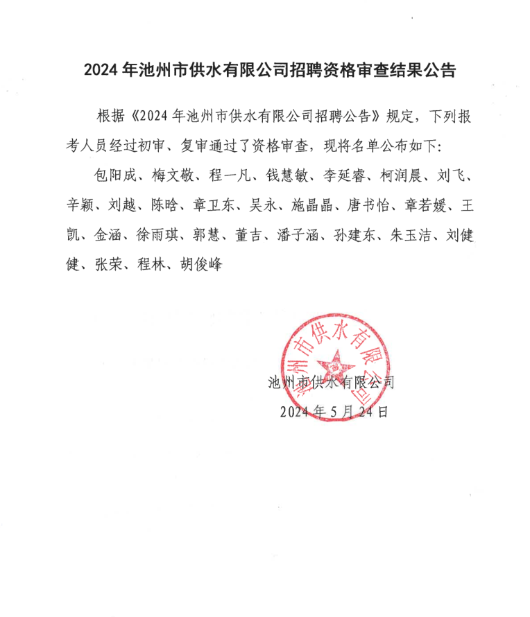 | 2024 年池州市供水有限公司招聘資格審查結(jié)果公告 | |