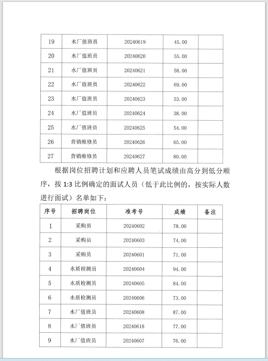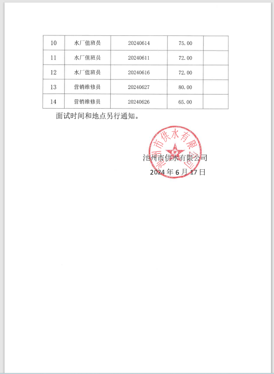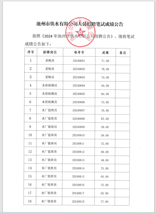 | 池州市供水有限公司人員招聘筆試成績(jī)公告 | |