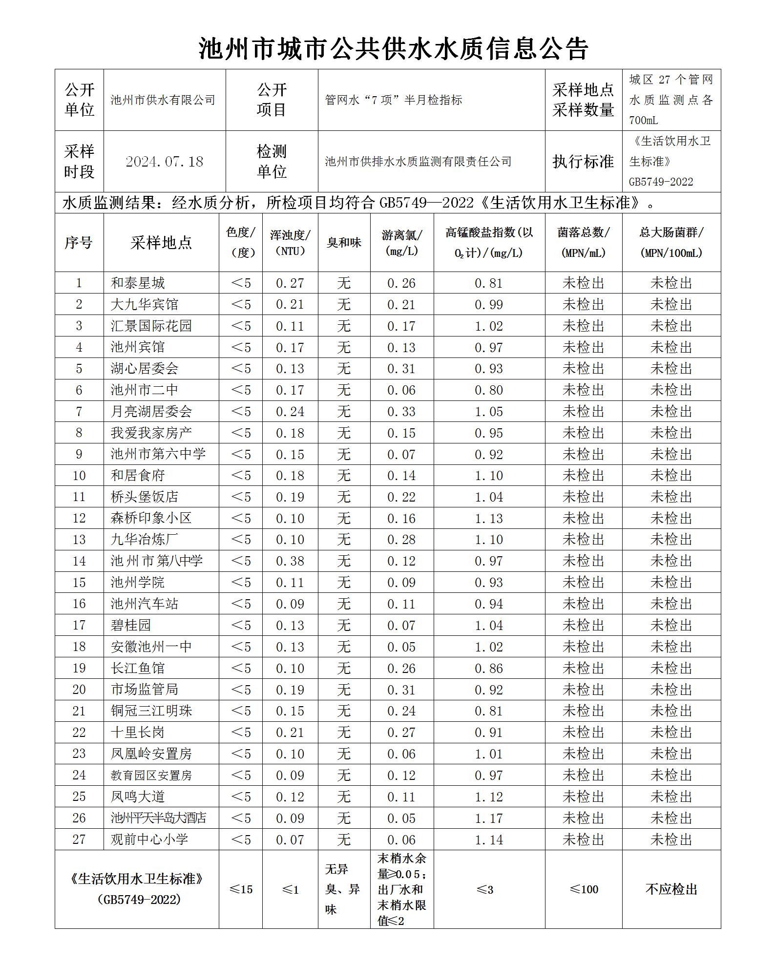 | 池州市城市公共供水水質信息公告管網水“7項”半月檢指標07-2 | |