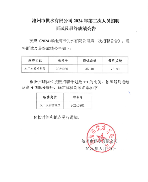 | 池州市供水有限公司2024年第二次招聘面試及最終成績公告 | |