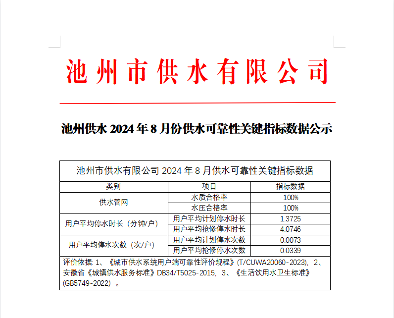 | 池州供水2024年8月份供水可靠性關(guān)鍵指標(biāo)數(shù)據(jù)公示 | |
