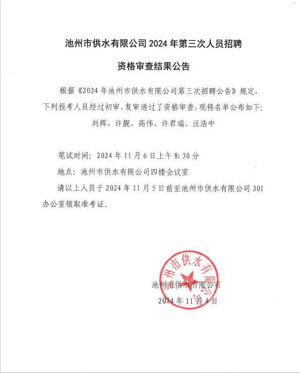 | 池州市供水有限公司2024年第三次招聘資格審查結(jié)果公告 | |