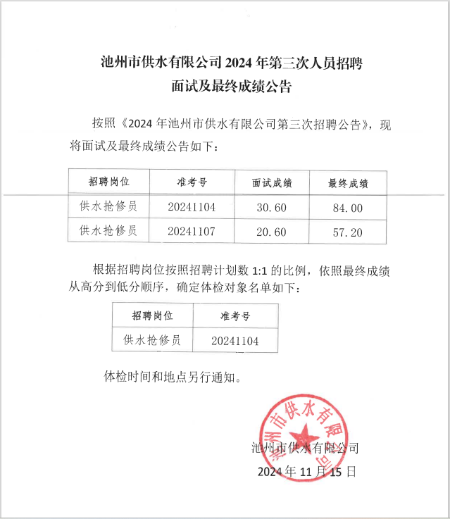 | 池州市供水有限公司2024年第三次人員招聘面試及最終成績公告 | |