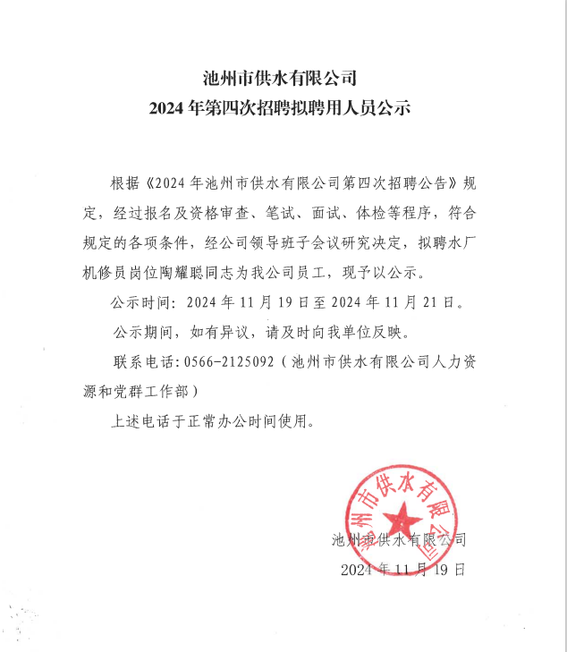 | 池州市供水有限公司2024年第四次招聘擬聘用人員公示 | |
