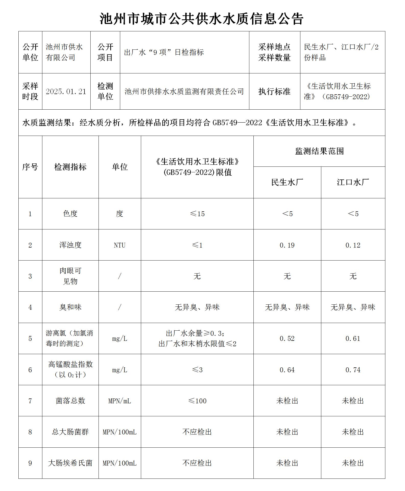 | 池州市城市公共供水水質(zhì)信息公告出廠水“9項(xiàng)”日檢指標(biāo)2025.01.21 | |