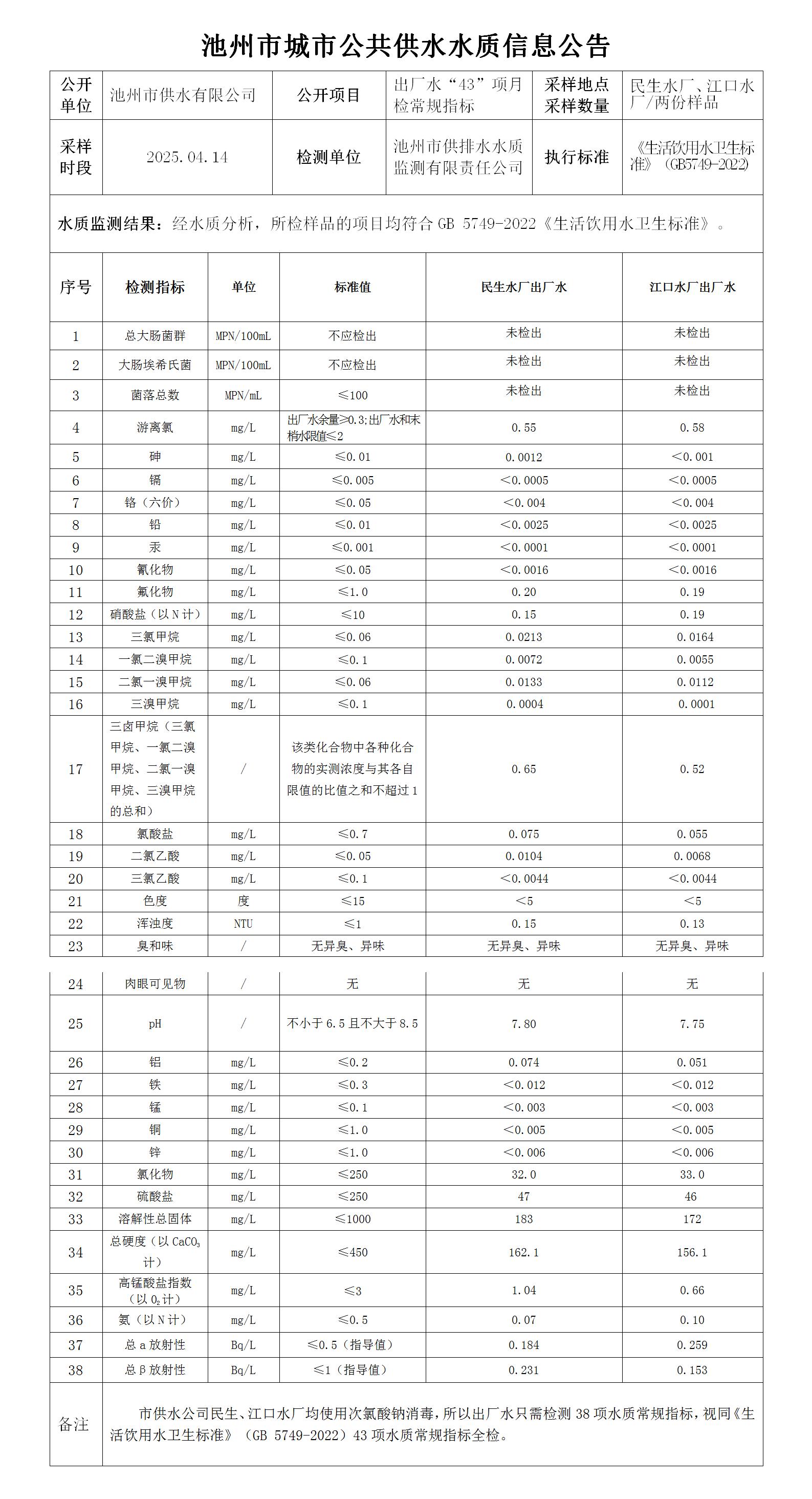 | 池州市城市公共供水水質信息公告4月份出廠水月檢常規(guī)指標 | |