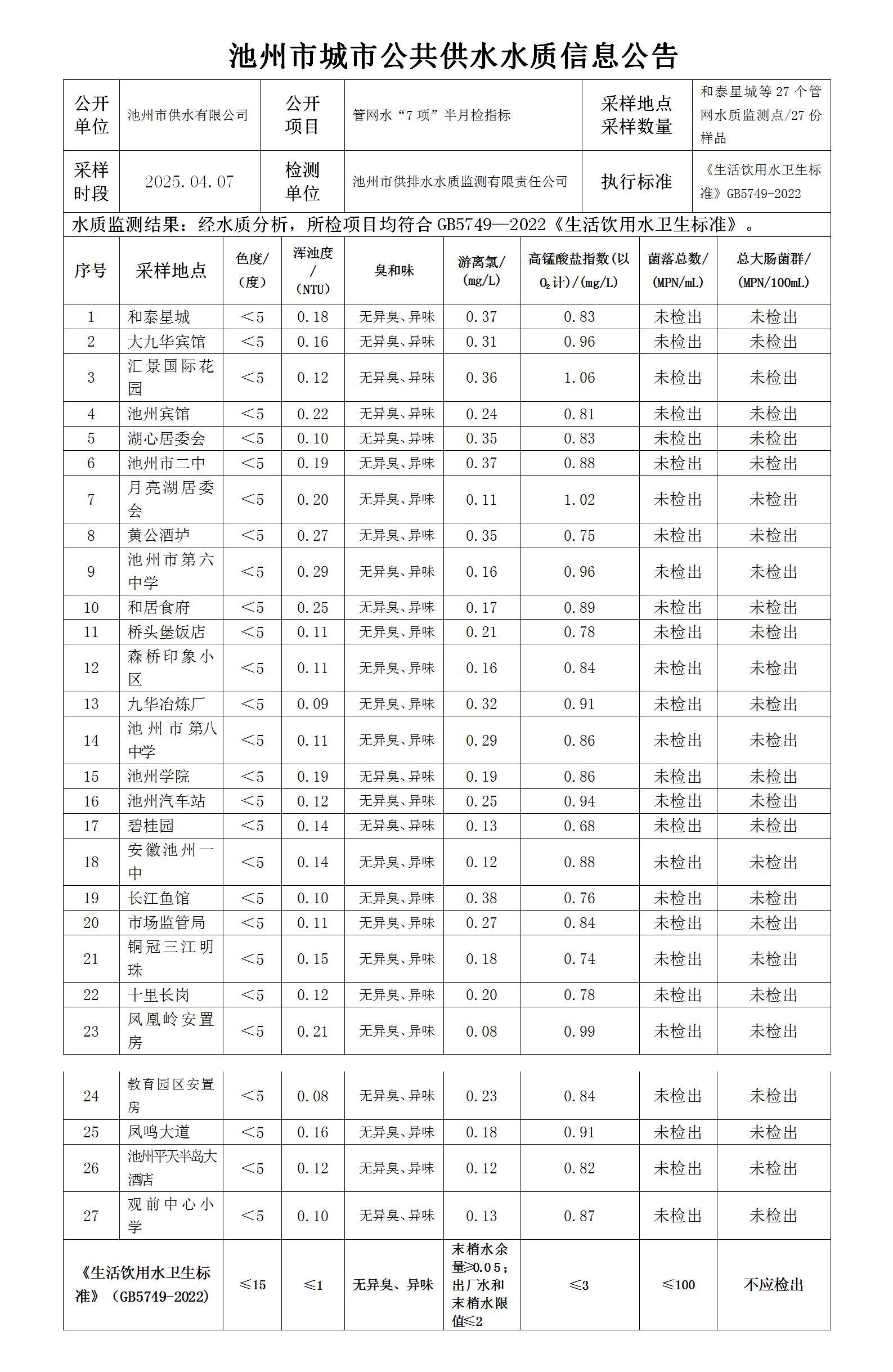 | 池州市城市公共供水水質信息公告管網水“7項”半月檢指標4-1 | |