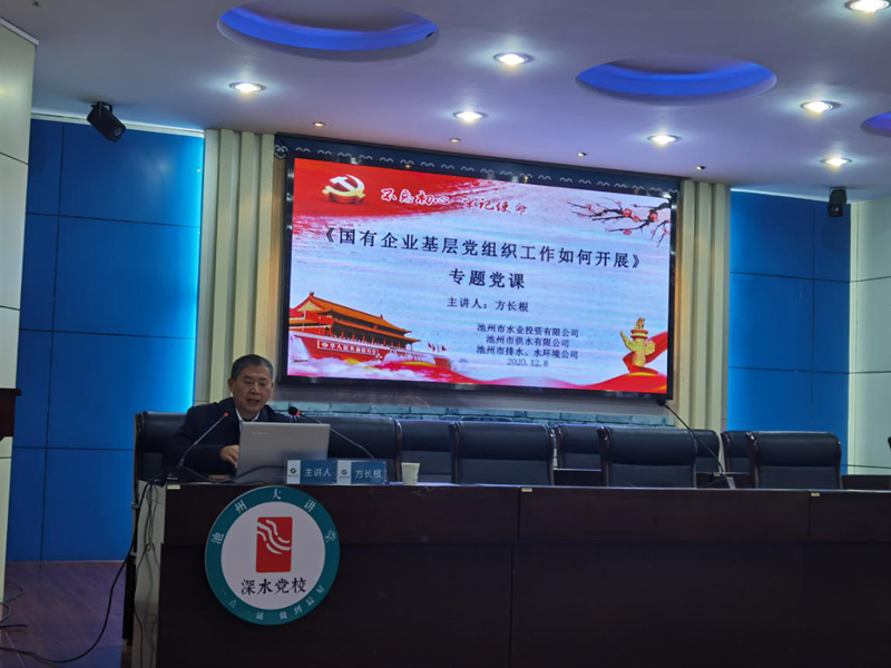 12月8日下午,池州建投集團黨委副書記方長根同志前往聯(lián)系點支部——市水業(yè)、供水、排水、水環(huán)境四公司上專題黨課,近80名黨員參加了本次學(xué)習(xí)。會議由供水公司支部書記、董事長楊觀樂同志主持。