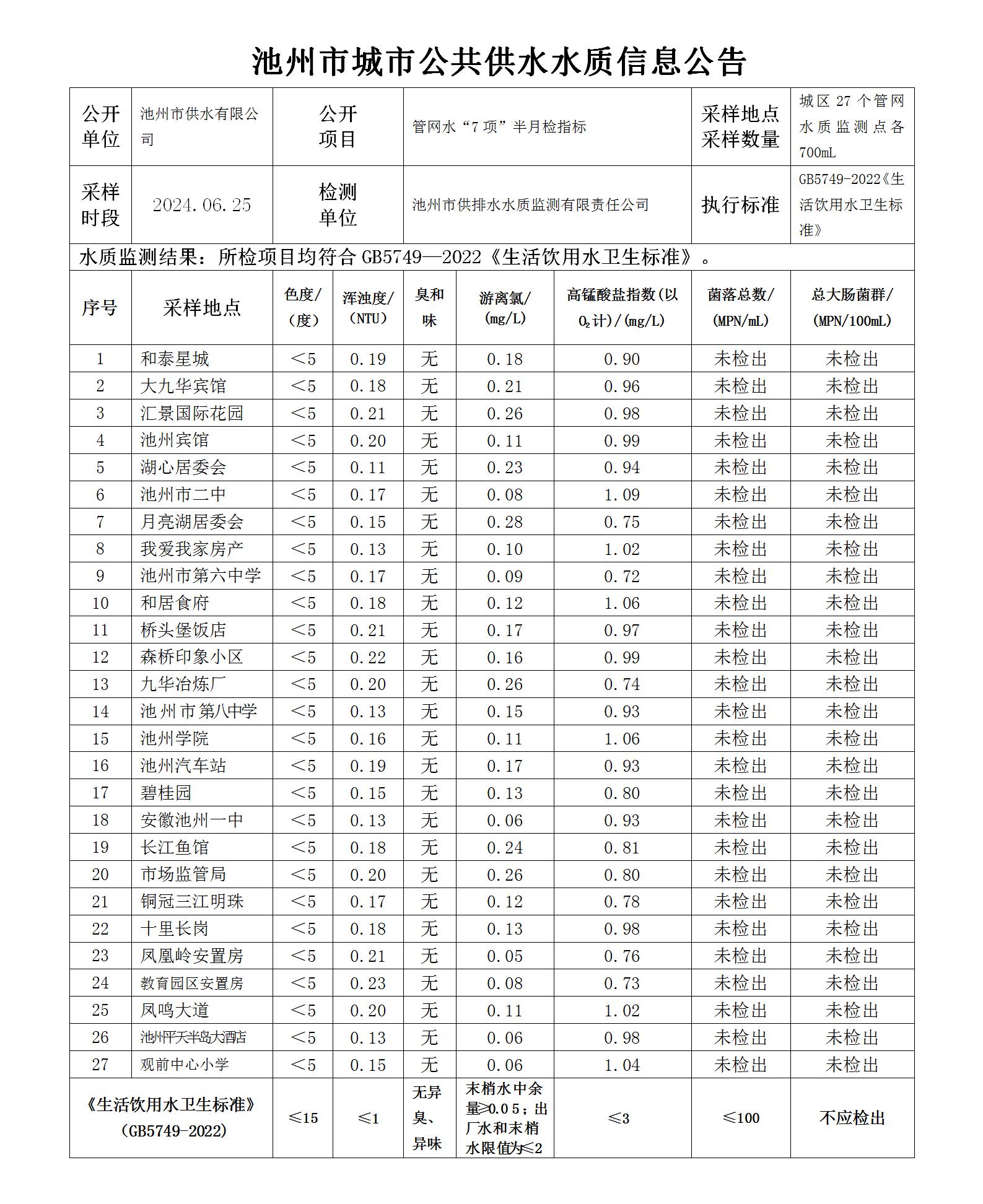 | 池州市城市公共供水水質(zhì)信息公告管網(wǎng)水“7項”半月檢指標(biāo)2024.06.25 | |